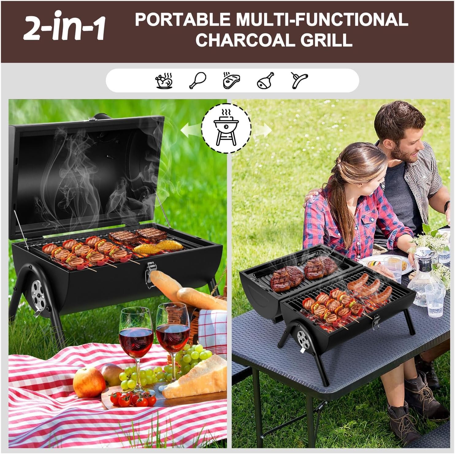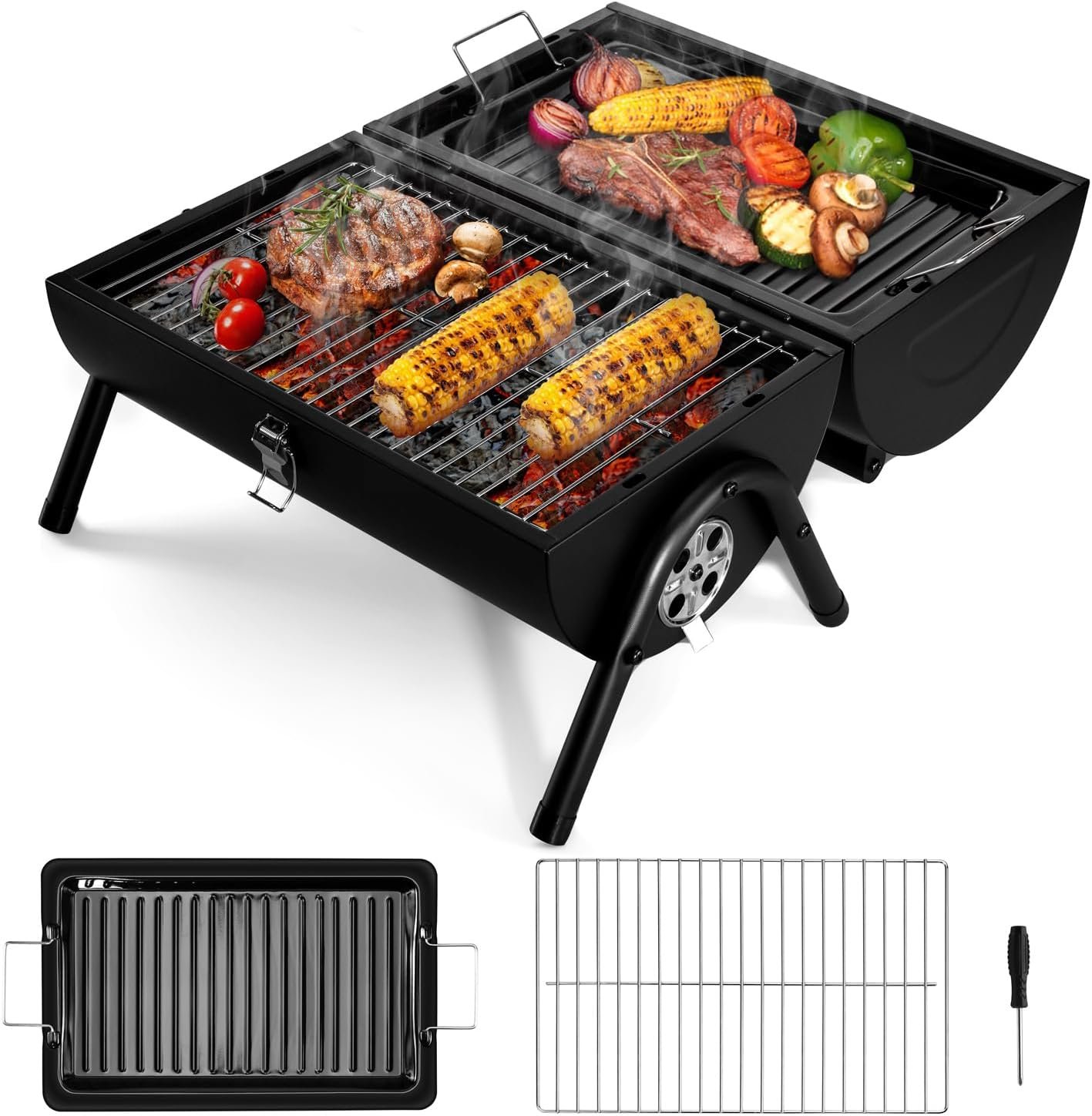[DOUBLE-SIDED GRILL] – Double-sided charcoal grill opening doubles the grilling space and easily meets the needs of family grilling, Or use one side as a lid and grill a whole chicken to get a smoky flavor grilled chicken, Ideal for cooking burgers, fish, vegetables, kebabs, steaks, ribs, sausages