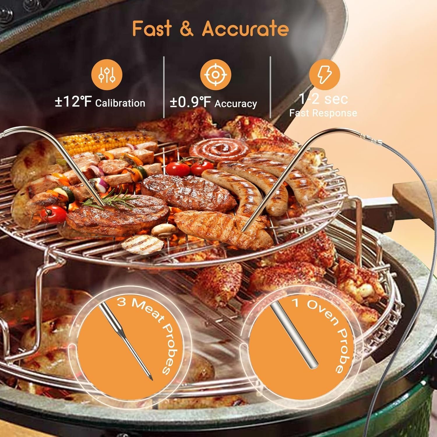 ±0.9℉ Accurate Measurement & ±12℉ Calibration Function: Its four food-grade stainless steel probes all feature high measurement accuracy of ±0.9℉ and support ±12℉ temperature calibration. Each probe supports a short-time measurement range from 32℉~572℉(0℃ to 300℃) and a continuous monitoring range from 32℉~482℉ (0℃ to 250℃). We can set temperature alarms and timers to avoid overcooking and undercooking