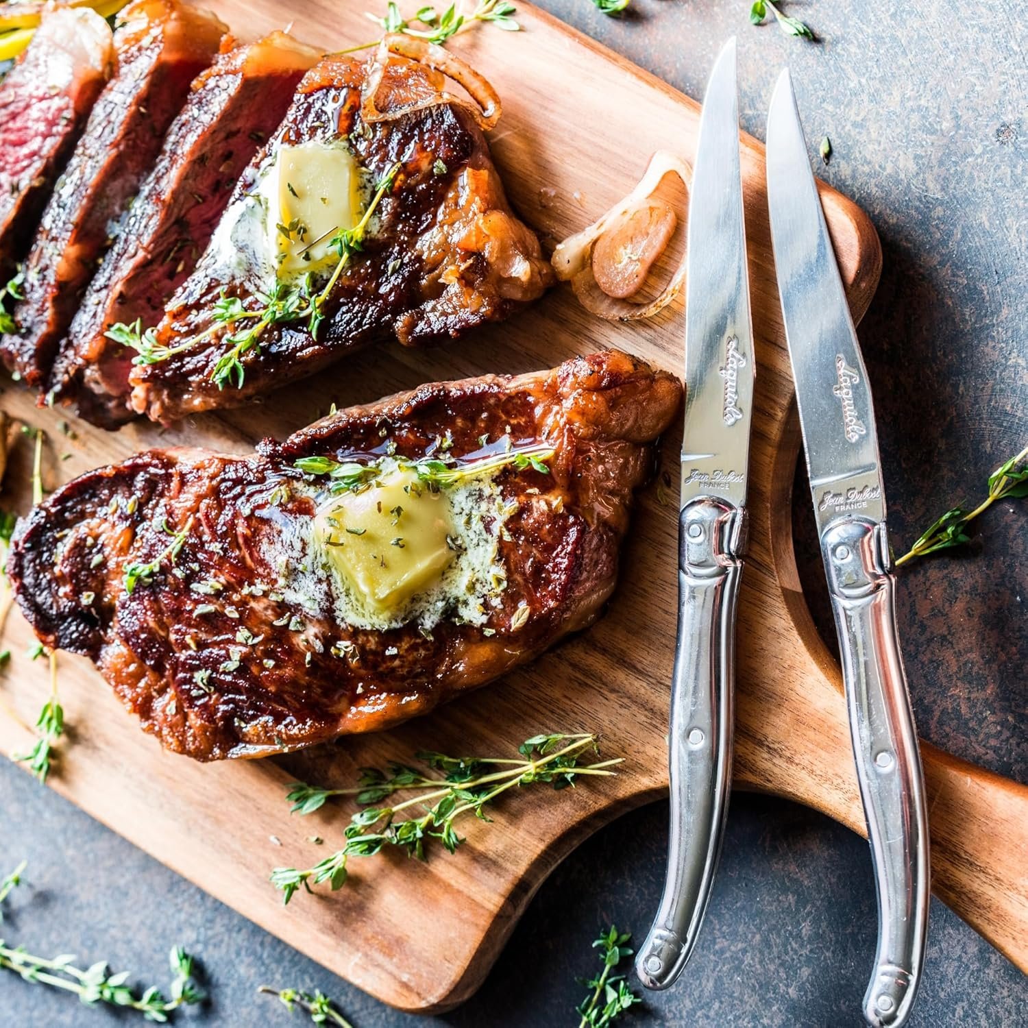 STAINLESS STEEL BLADES – Master cutlers forge, polish, and sharpen the 1.2 mm, stainless steel blades by hand, just like in traditional French knife making. Then, they rivet their handles onto the grip, giving each knife its own character.