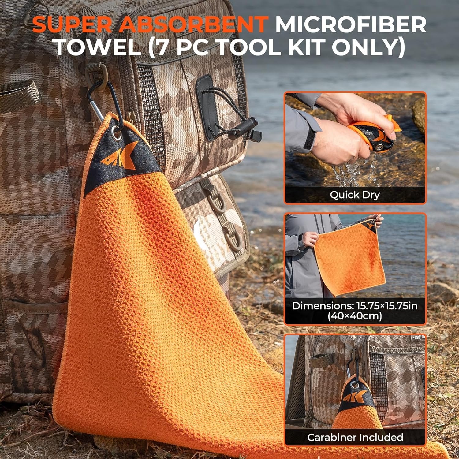 15.75” x 15.75” Microfiber Fishing Towel With Carabiner: Stay clean on the water with this super-absorbent microfiber towel, perfect for wiping hands, fishing gear, and rods. The included carabiner clip lets you attach it to your tackle bag, belt loop, or boat for easy access. Durable and quick-drying, it’s a must-have accessory for any angler