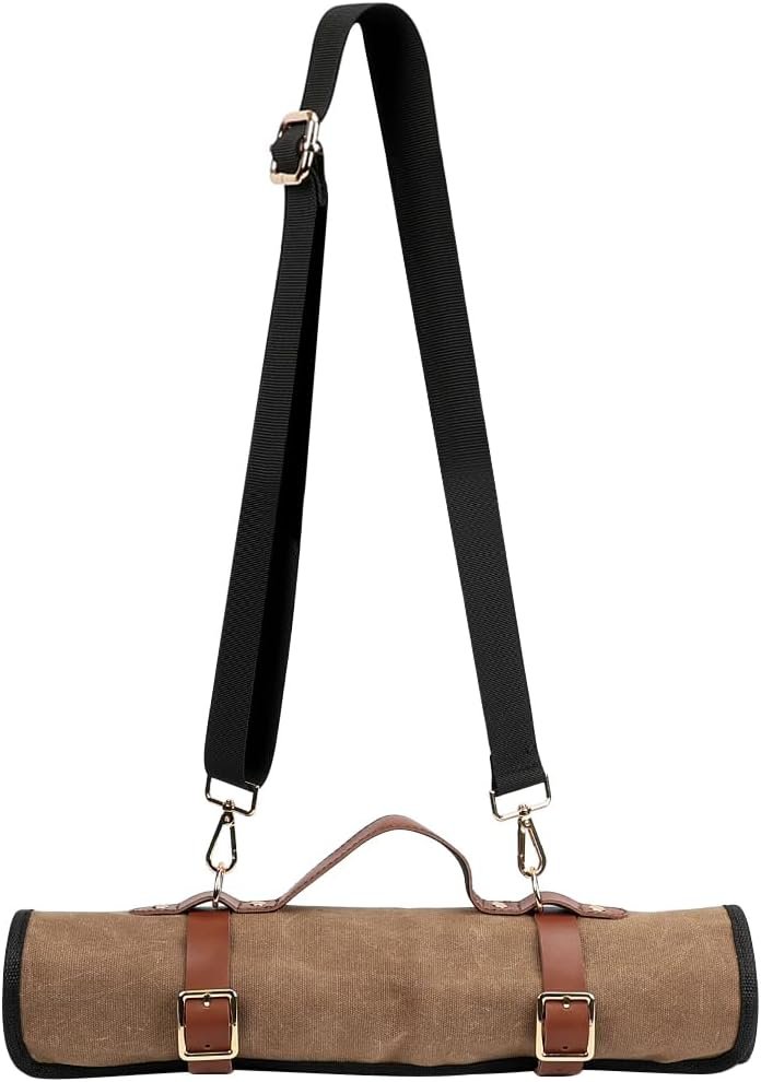 Knife Roll with PU Leather Straps and Metal Buckles, Double Layer Waxed Canvas Knife Bag, Large Chef Knife Bag with Handle and Shoulder Strap