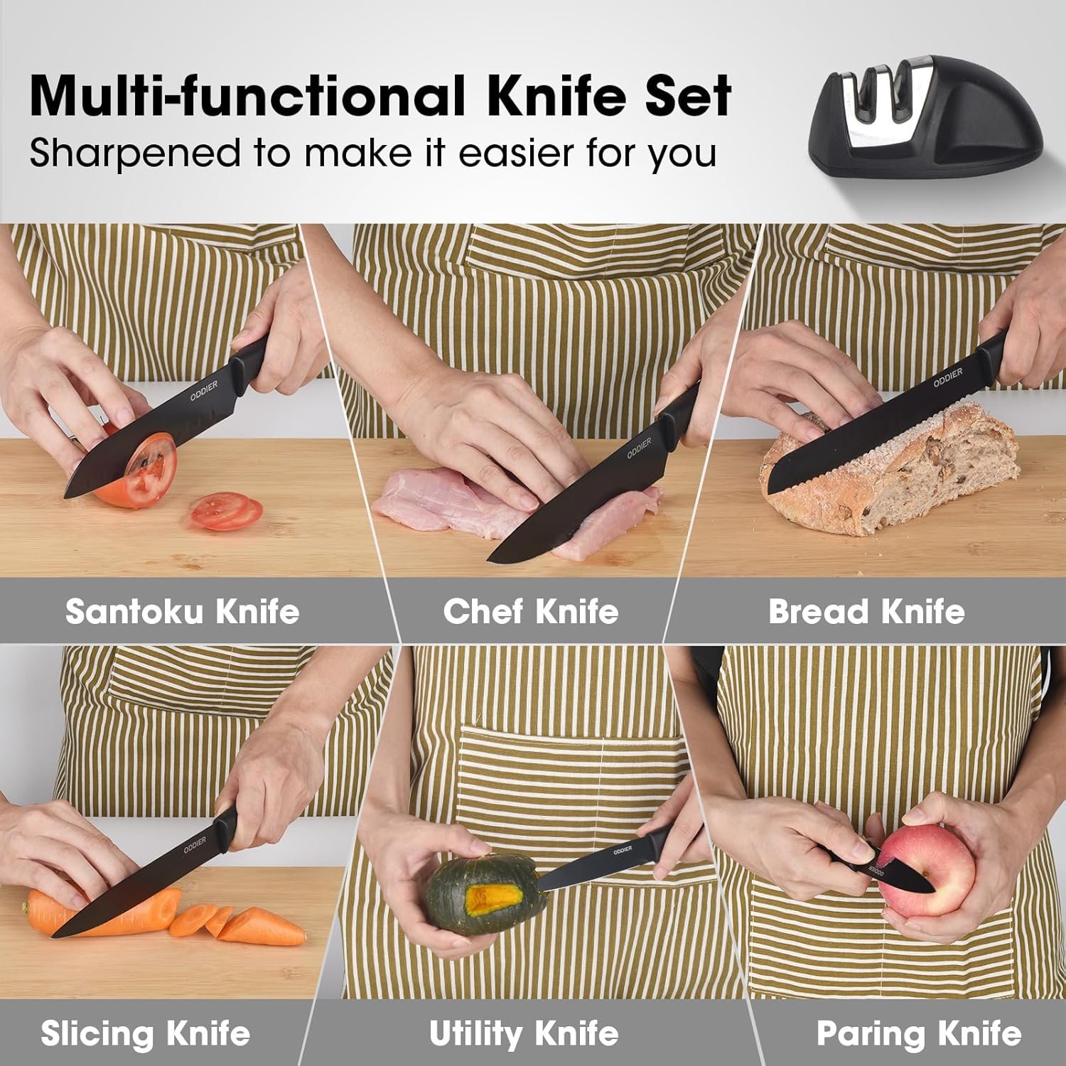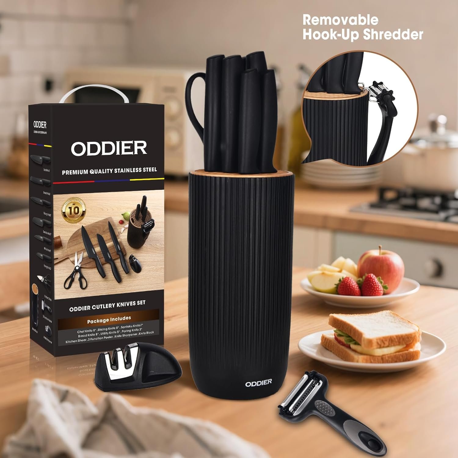 10 IN 1 KITCHEN KNIFE SET – ODDIER Kitchen Knife Set includes1 x 8″ Chef’s Knife, 1 x 8″ Slicing Knife, 1 x 8″ Bread Knife, 1 x 7″ Santoku Knife 1 x 5″ Utility Knife, 1 x 3″ Paring Knife, 1 x Kitchen Shear, 1 x 3 Function Peeler, 1 x Knife Sharpener, 1 x Universal Knife Block. It keeps knives organized, saves space, meet all your kitchen needs.