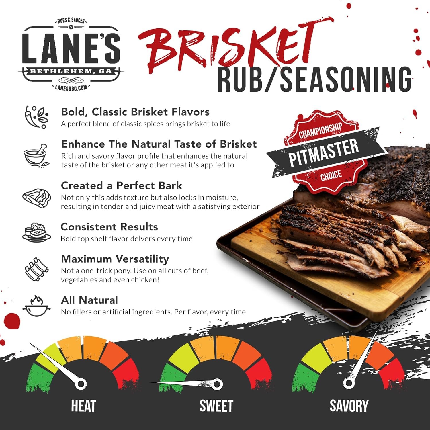 Lane’s Brisket Rub Seasoning, All-Natural Championship Butt Rub Seasoning, Perfect for Burger, Steaks, and Pork Rubs for Smoking, Made in USA, 12.4 Oz