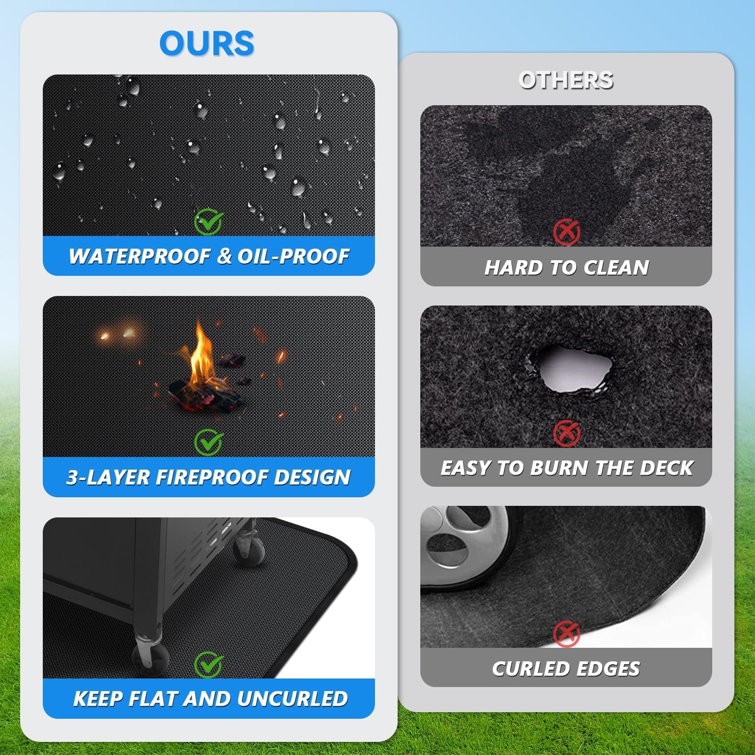 Double-sided Fireproof & Oil-proof: The under grill mat is made of fireproof fiberglass material and evenly coated with heat-resistant silicone coating on both sides, which is high temperature resistant up to 2000°F, effectively preventing accidental splashes of hot oil and embers from damaging your deck and lawn.