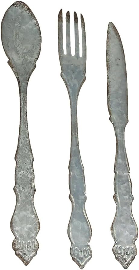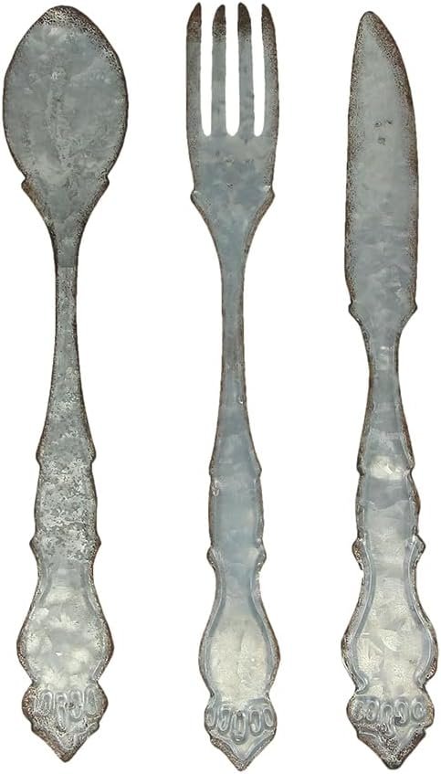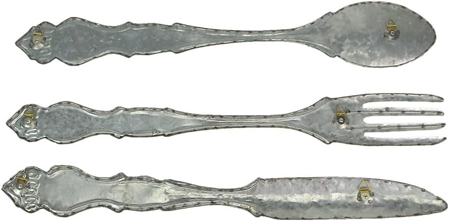 Description Fork: 21 inch Long, 2.5 inch Wide, .25 inch Thick / Knife: 20.75 inch Long, 2.5 inch Wide, .25 inch Thick / Spoon: 20.5 inch Long, 3.5 inch Wide, .25 inch Thick. Made of Metal in a Rustic Galvanized Finish with Distressed Edges that Gives the Set a Wonderfully Weathered Appearance. A Rustic-Contemporary Art Home Decor Accent That Brings Artful Inspiration to Any Home Decor Setting. 3 Piece Set Can Be Hung Together or Displayed On Separate Walls to Bring a Cohesive Look Perfect for in the Kitchen or Dining Room. Arrives Ready to Hang with a Pre-Installed Triangle Mounting Hanger On the Back. These size large, gray utensils are a fun and creative way to make a plain wall really stand out. The three-piece oversized set of a fork, spoon, and knife in a farmhouse design is made of metal in a rustic galvanized finish with beautifully distressed edges that gives them a wonderfully weathered patina. The set arrives ready to hang with a pre-installed triangle mounting hanger on the back. Each piece measures approximately 21 inches long, 2.5 inches wide and .25 inches thick. Bon Appetite! Fork: 21 inch Long, 2.5 inch Wide, .25 inch Thick / Knife: 20.75 inch Long, 2.5 inch Wide, .25 inch Thick / Spoon: 20.5 inch Long, 3.5 inch Wide, .25 inch Thick. Made of Metal in a Rustic Galvanized Finish with Distressed Edges that Gives the Set a Wonderfully Weathered Appearance. A Rustic-Contemporary Art Home Decor Accent That Brings Artful Inspiration to Any Home Decor Setting. 3 Piece Set Can Be Hung Together or Displayed On Separate Walls to Bring a Cohesive Look Perfect for in the Kitchen or Dining Room. Arrives Ready to Hang with a Pre-Installed Triangle Mounting Hanger On the Back. These size large, gray utensils are a fun and creative way to make a plain wall really stand out. The three-piece oversized set of a fork, spoon, and knife in a farmhouse design is made of metal in a rustic galvanized finish with beautifully distressed edges that gives them a wonderfully weathered patina. The set arrives ready to hang with a pre-installed triangle mounting hanger on the back. Each piece measures approximately 21 inches long, 2.5 inches wide and .25 inches thick. Bon Appetite! Additional Details SKU: ZKO-39214 UPC: 850000392144 Condition: New Product Dimensions: 21 x 2.5 x 0.25 Inch Material: Metal