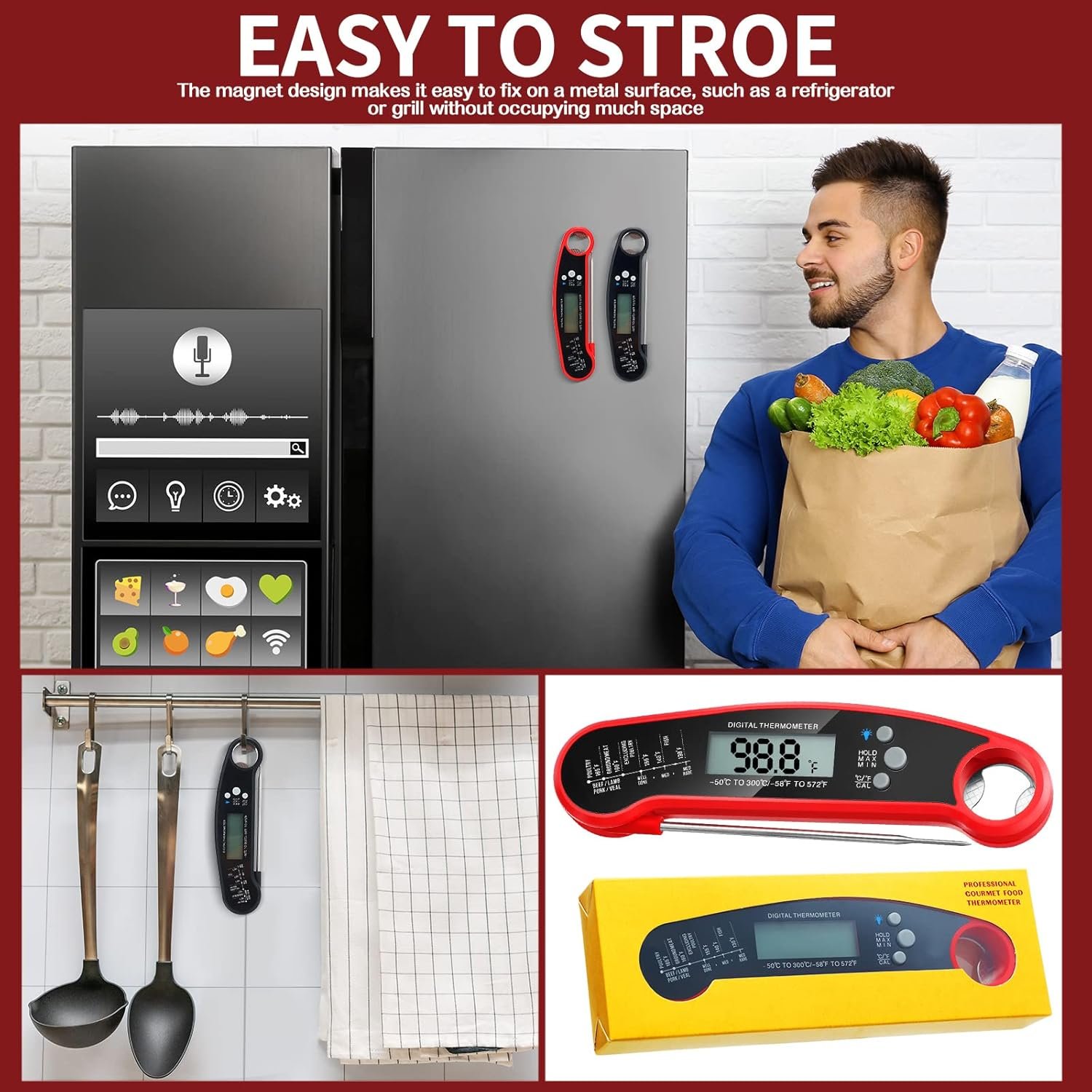 Easy to Store: the read food thermometer is designed with a foldable probe, so when you’re not using it, you can fold it up, and the magnet design makes it easy to fix on a metal surface, such as a refrigerator or grill without occupying much space