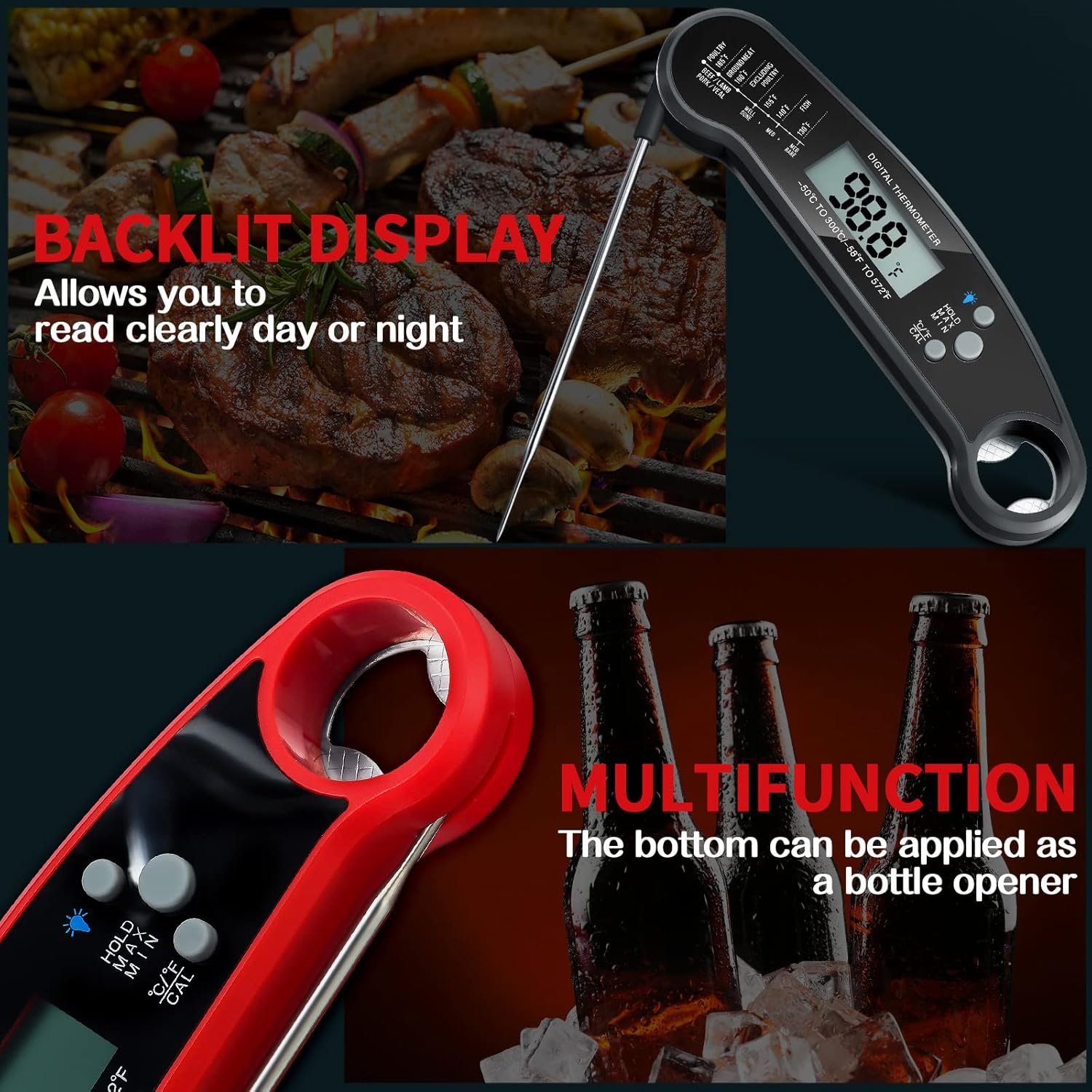 Wide Functions: the read meat thermometer is waterproof for your daily cleaning and the bottom can be applied as a bottle opener, besides, the design of the light screen helps you to quick and accurate reading, bringing you a pleasant using experience