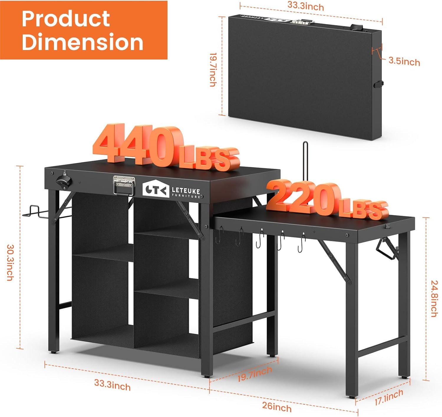 High load-bearing grill table is a good assistant for your outdoor cooking. With multiple storage spaces, the grill stand can keep your grill tools, food, and other grilling essentials handy. Create a spacious and solid space to barbecue, and prepare food anywhere.