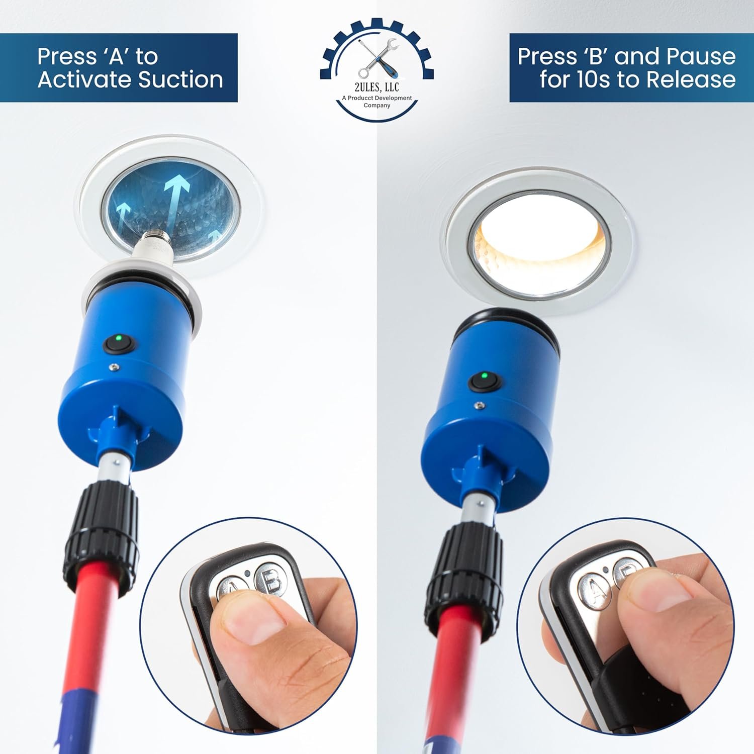HOW TO USE: Charge the transmitter for 3 hours before using the devide. The red light wont change color, even when fully charged. Press the “A” button to activate suction and “B” to release. Center the suction cup on the bulb, press gently, and twist counter clockwise to remove. Attach the new bulb, twist clockwise until it lights up, then press “B” to release after 10 seconds.