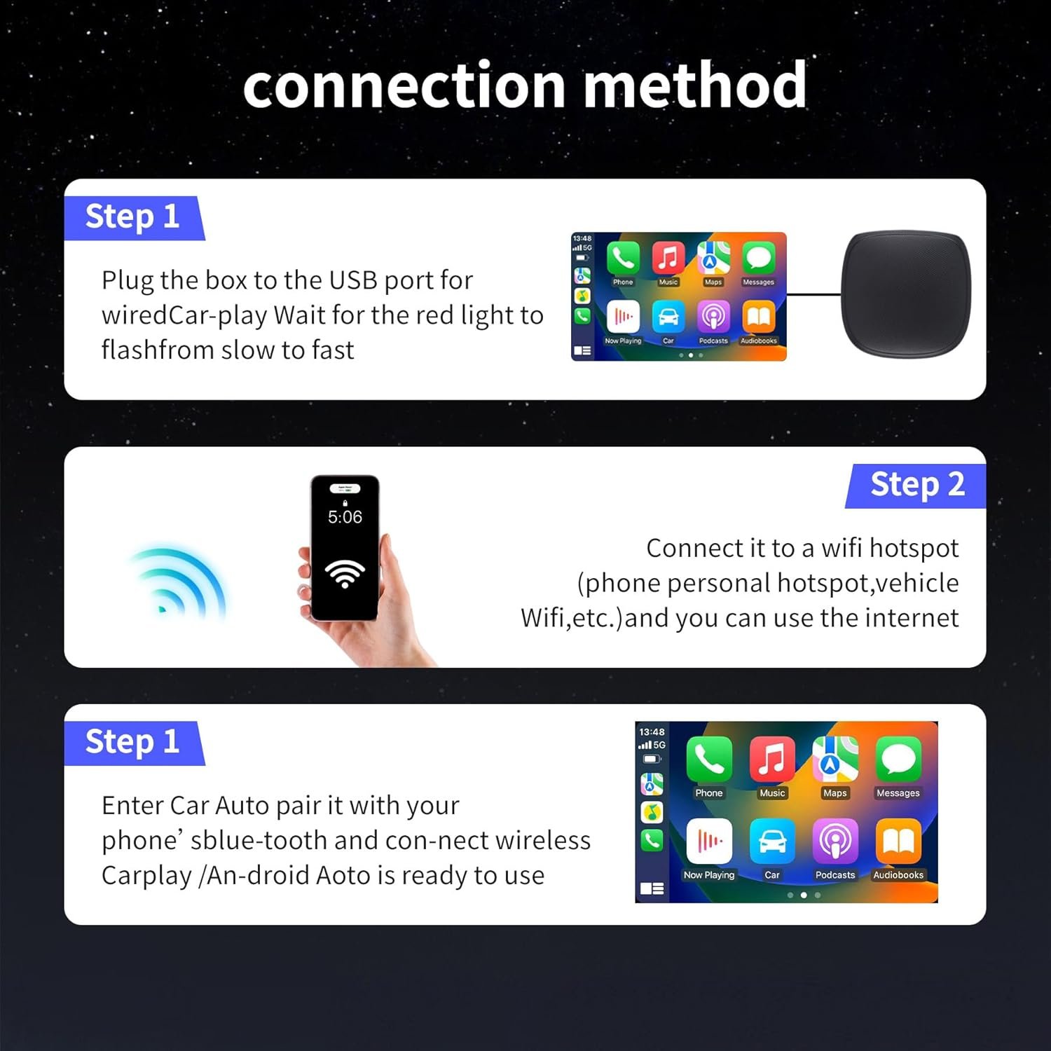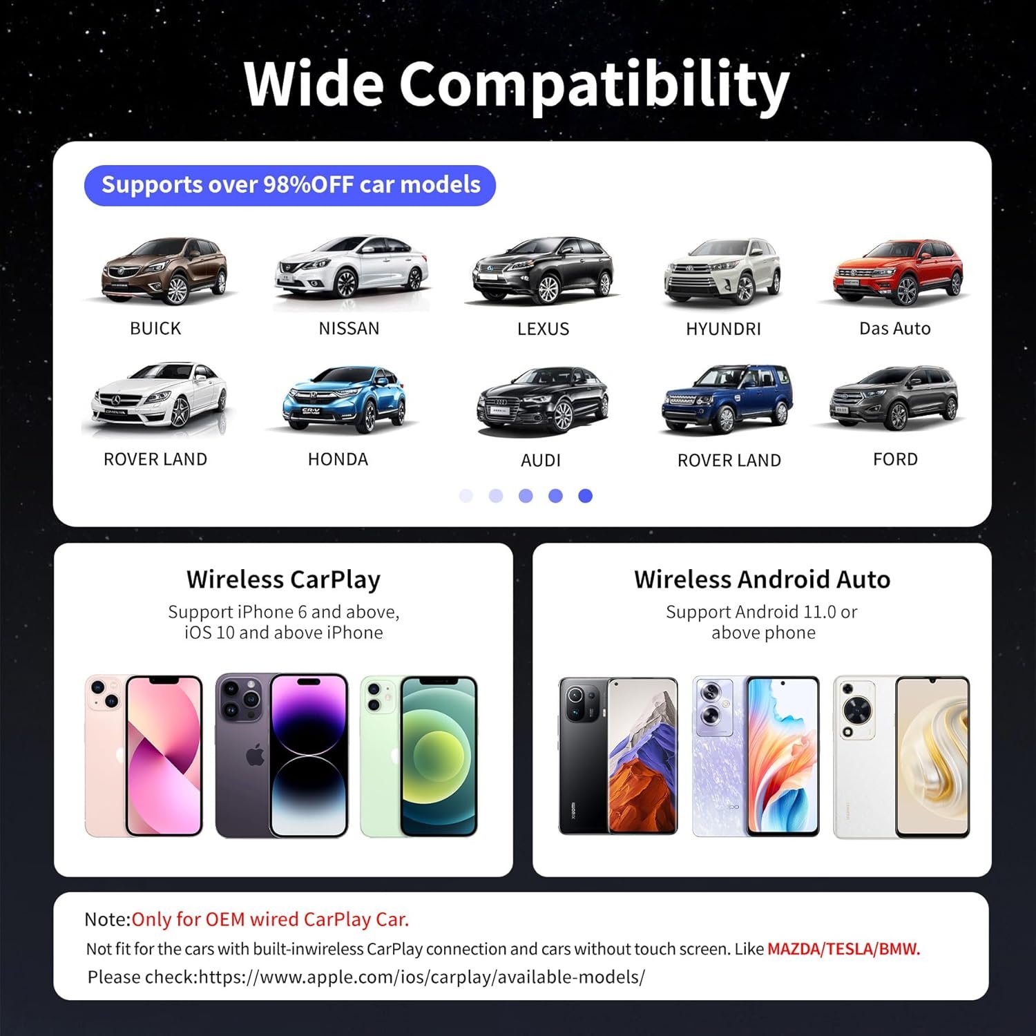 【Wide Compatibility】Designed specifically for cars that have wired carplay functionality, our wireless carplay adapter is compatible with most OEM wired carplay models. Also compatible with 2022 and later new models with large screens, such as Ford F-150, Lexus NX, Mustang Mach-E, etc. The adapter includes a USB cable and a USB C adapter, making it suitable for various car models and series. Please note that it is compatible with iOS10/Android 11 or newer versions (excluding HUAWEI).