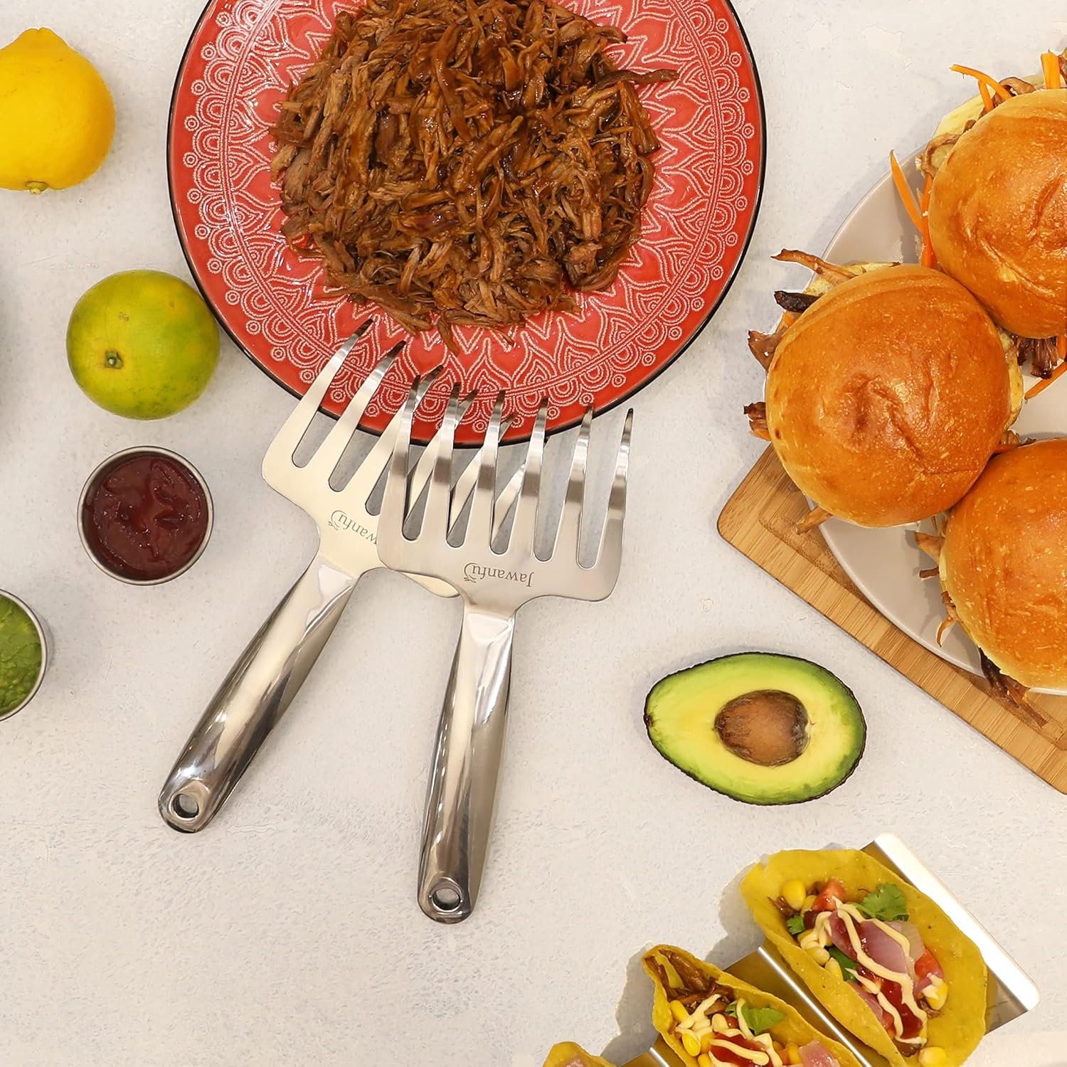 Easy and Fast Meat Shredder Claws: Jawanfu griddle accessories for shredding meat have 6 wide and sharp tines per hand. Easily grasp and shred meat, like chicken, pork shoulder, beef, brisket, whatever meat you are grilling, roasting, or pulling