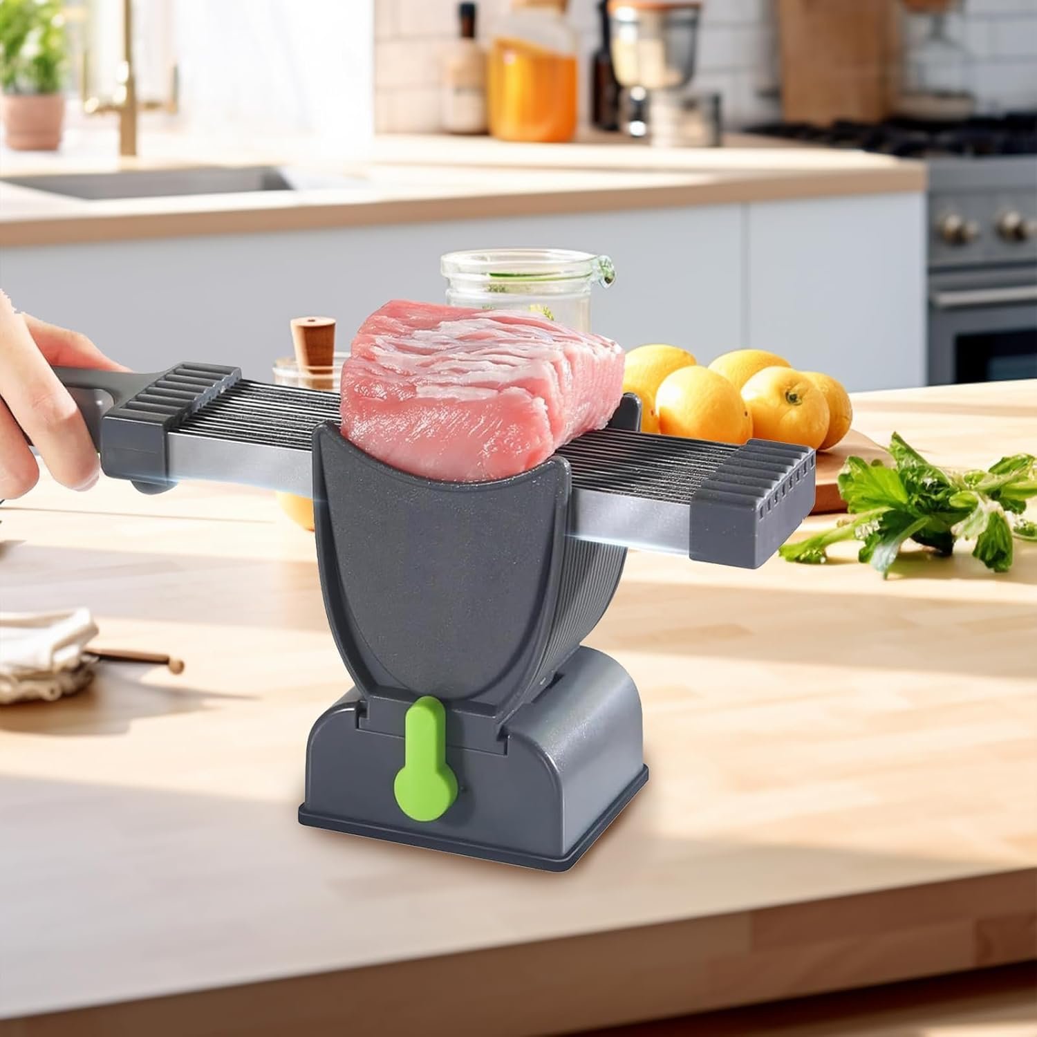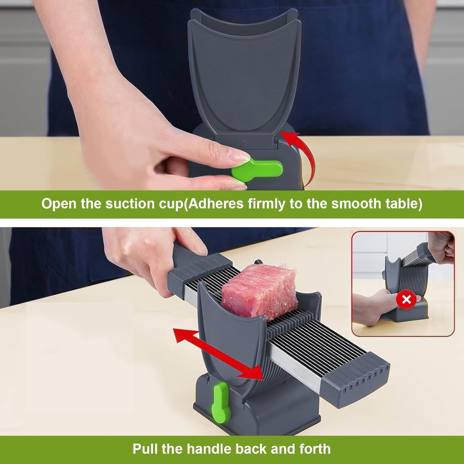 Ergonomic Design: The meat slicer includes an easy-to-operate lever system, making it safe and effortless to cut through different types of food. The slicer features a strong suction base that securely attaches to smooth surfaces when activated. This ensures stability during use, preventing wobbling or movement for a safer and more efficient slicing experience.