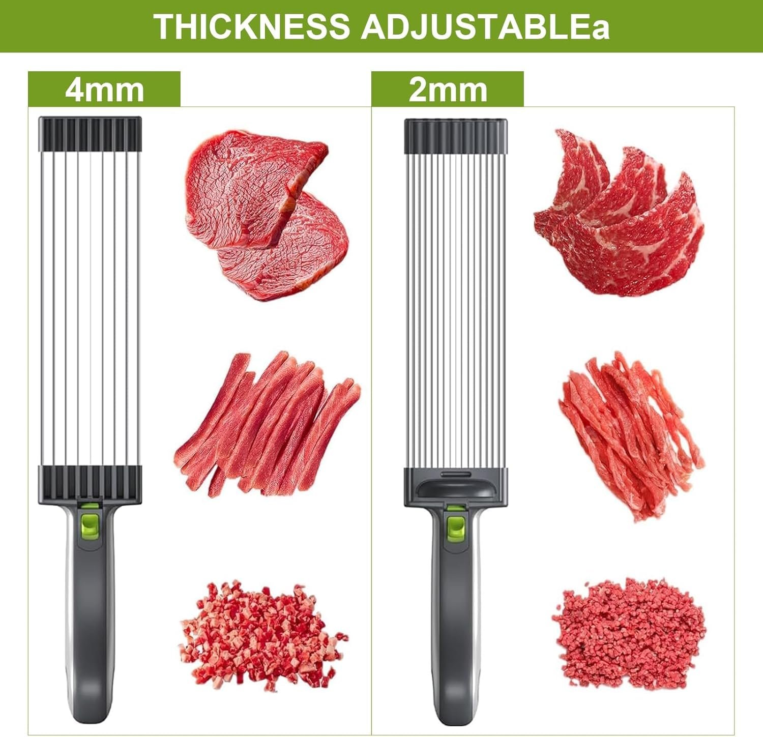 Efficient and Time-Saving: The manual slicer speeds up food preparation by delivering uniform slices in seconds. Comes with two interchangeable blade sets, allowing flexibility to cut meat slices into 2mm or 4mm thickness. Its adjustable thickness settings allow for customized cuts, ensuring consistent results whether for stir-fries, hot pot, or other dishes.