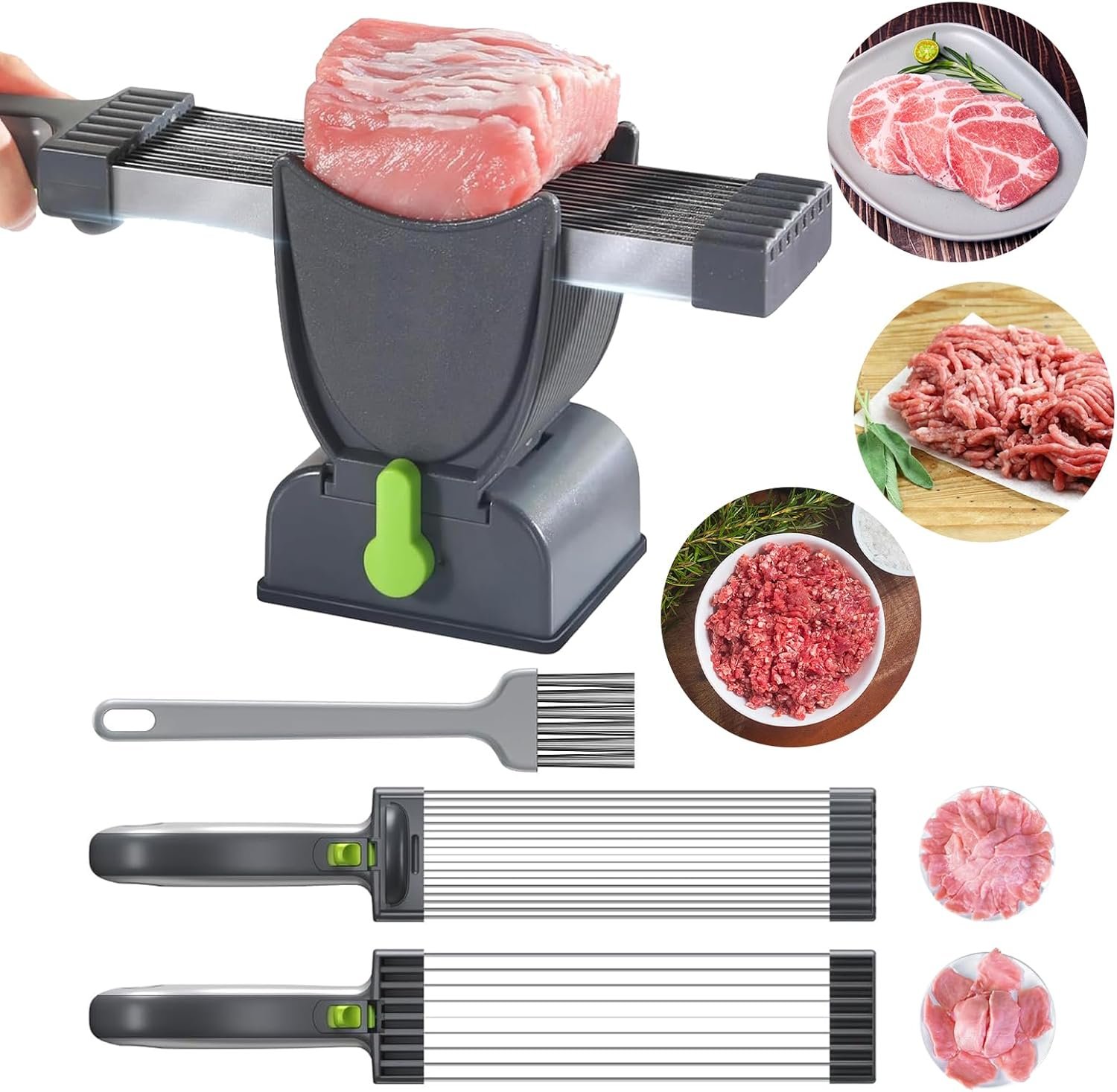 Versatile Usage: This meat slicer set is the ultimate tool for precise cutting, equipped with 17 blades to effortlessly slice fresh meat into 18 even pieces in a single motion. The set includes specialized knives for cutting, slicing, and shredding meat, vegetables, and other ingredients. The manual meat slicer enhances efficiency, perfect for preparing thin slices for hot pot, BBQ, or deli-style meats.(Note: Not suitable for frozen or cooked food.)