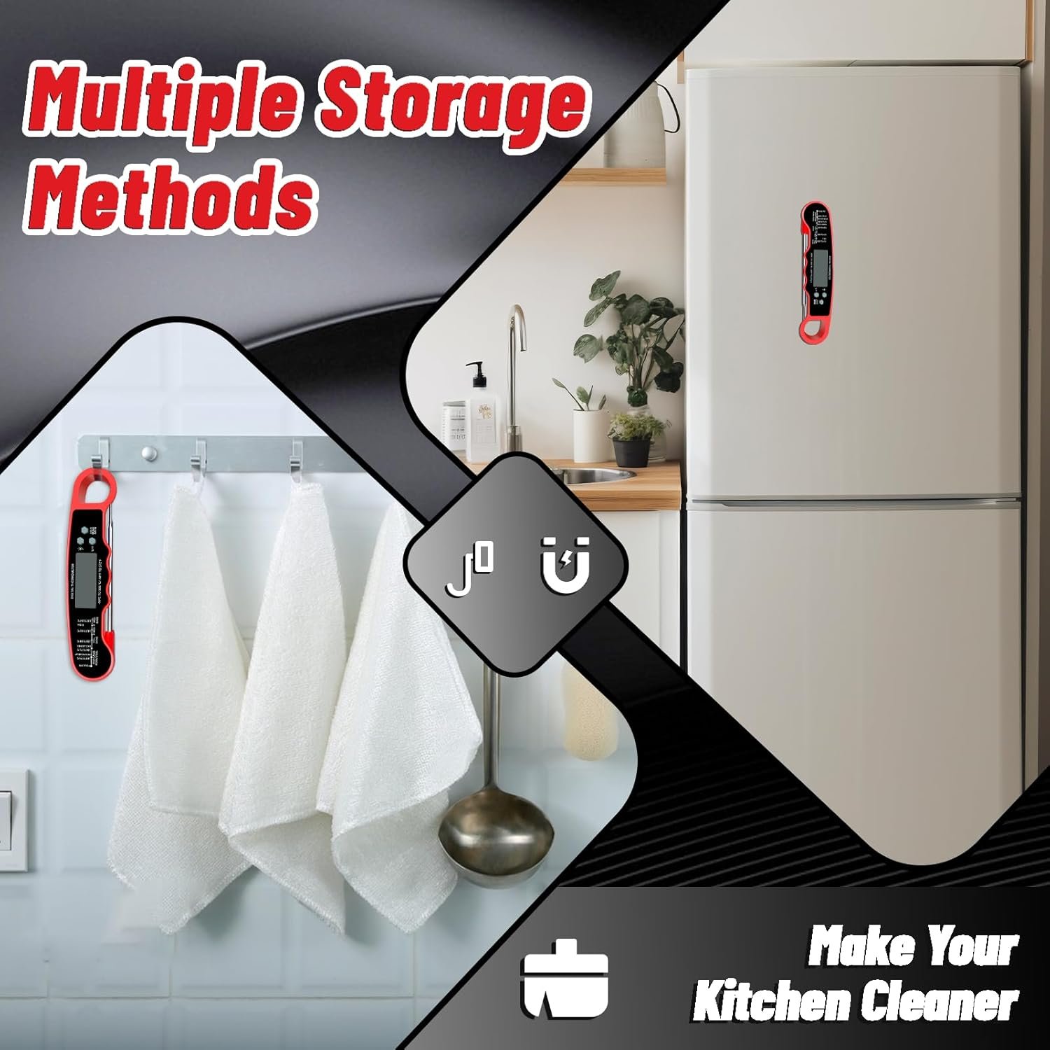 [CONVENIENCE IN LIFE STARTS WITH SIMPLE OPERATION]–The probe reads when unfolded, and closes when restored to its original position. It automatically closes after 3 minutes when not in use, saving power and providing peace of mind. The magnet and hanging hole design of the cooking thermometer will help you store it better. You can attach it directly to the refrigerator, or hang it on a hook to make your kitchen tidier.