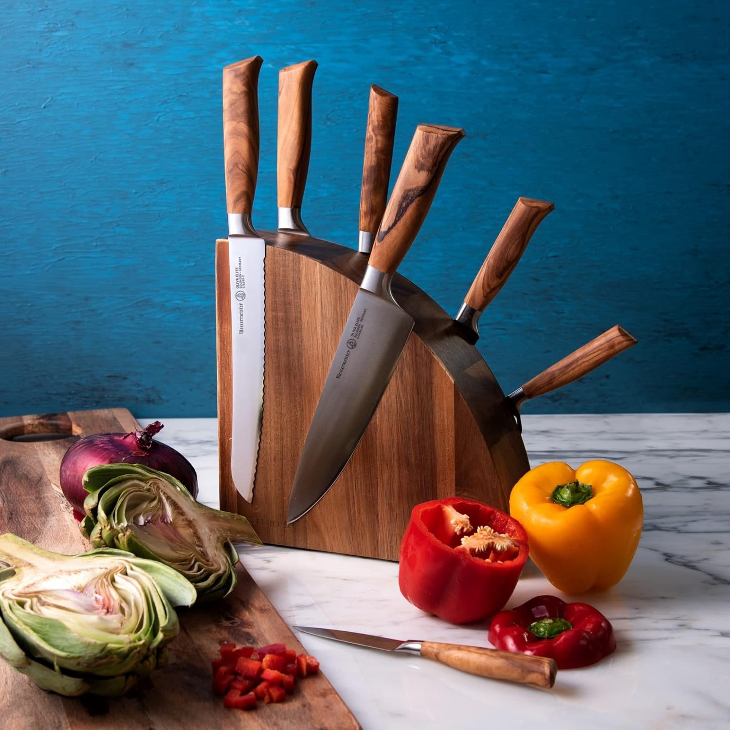 Messermeister Oliva Elite 8-Piece Magnet Block Set – Includes Chef’s, Bread, Carving, Fork, Cheese & Tomato, Utility & Paring Knife + Magnet Block