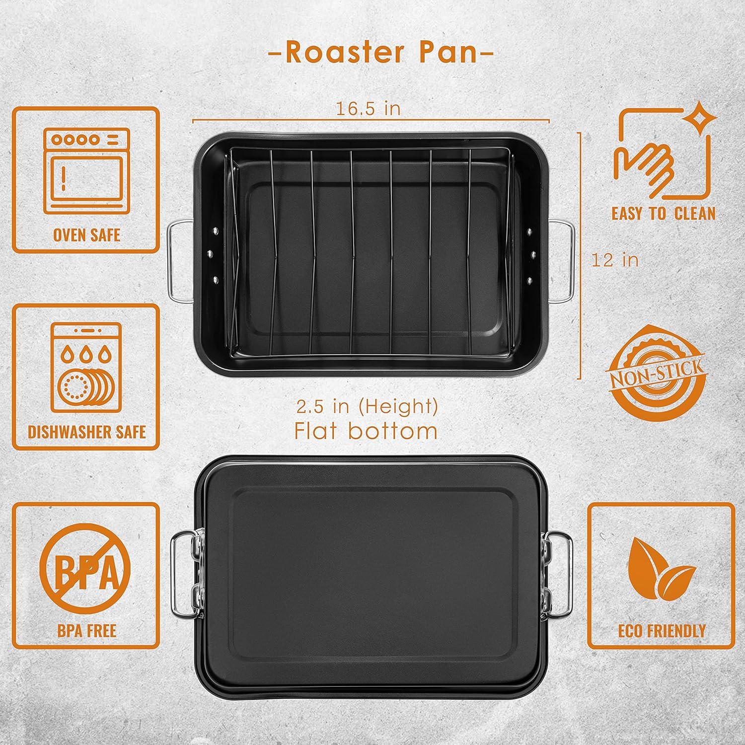 Non-Stick Roast Pan: This carbon steel roaster pan is made of the top materials, is friendly and PFOA free, has solid and heavy-duty construction, and has superior heat conduction for the fastest cooking of your delicious turkey. Oven safe up to 428°F.