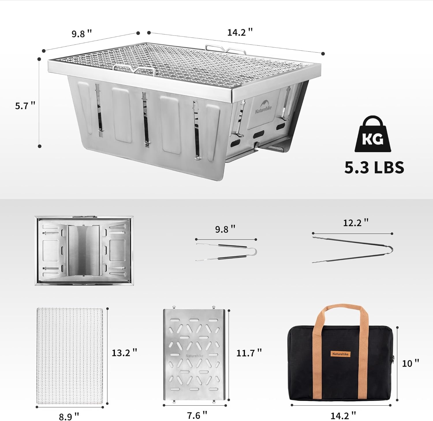 [SET UP & FOLD IN SECONDS] Naturehike folding grill requires no assembly, it can be taken out of the carry bag and set up in seconds. 2 BBQ tongs and carry bag included.