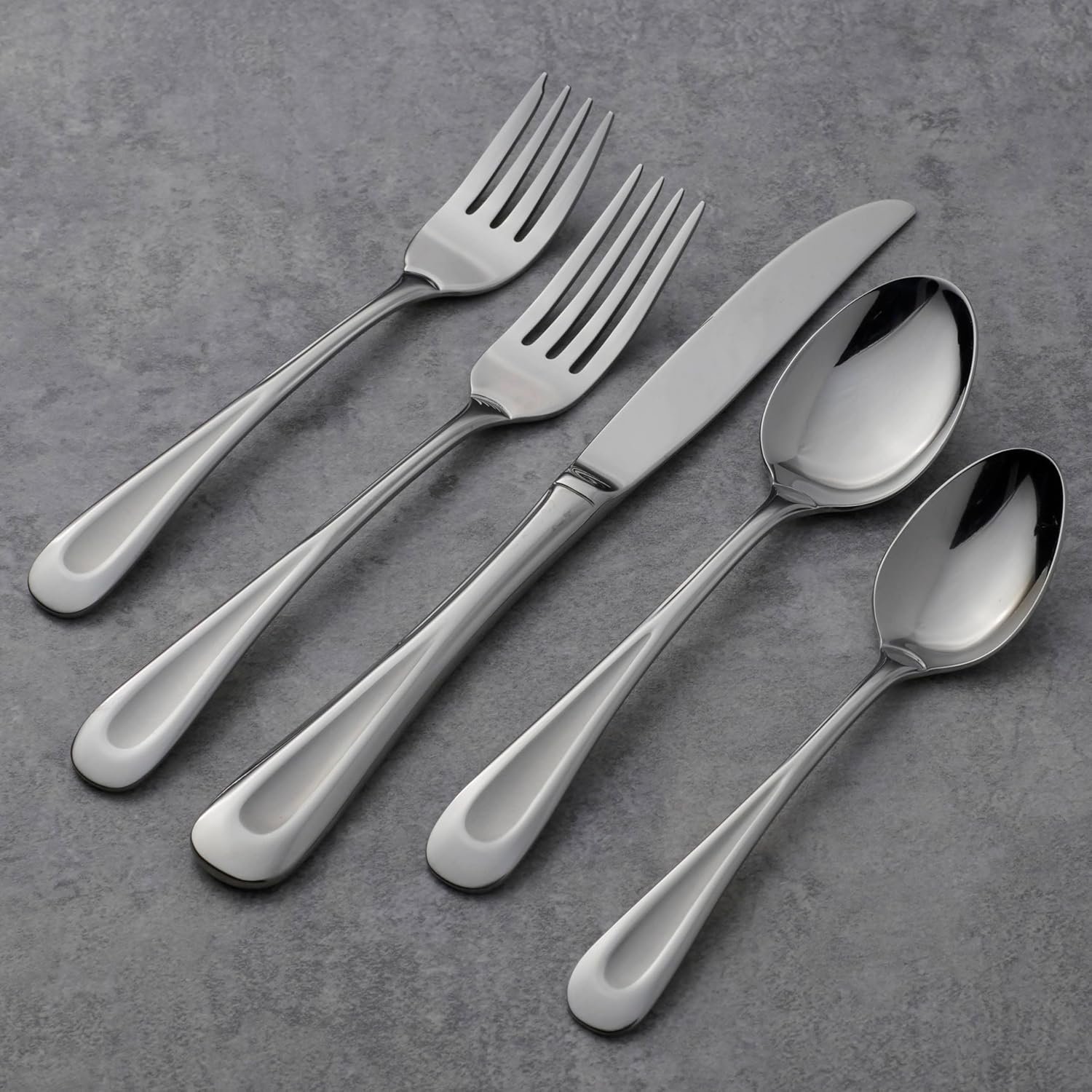 20-piece flatware set with service for 4. Set includes 4 each: place knife, place fork, place spoon, salad/dessert fork, and teaspoon