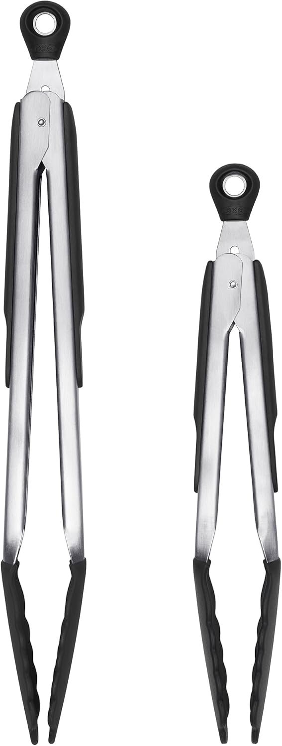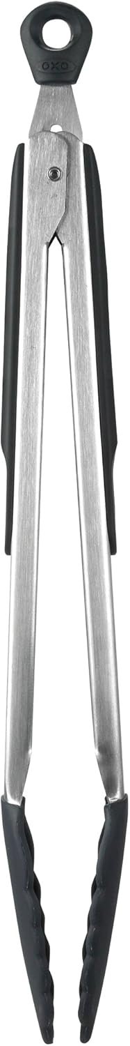 The OXO Good Grips classic Tongs are now available with Silicone Heads, making them the ideal tool for most in-kitchen meals. The 9-inch or 12-inch Tongs feature a stainless steel construction, soft non-slip grips with thumb rests and sturdy Silicone Heads. The Heads are heat resistant up to 600 degrees Fahrenheit and safe to use with non-stick cookware. When you’re ready to put the Tongs away, pull the tab to lock closed for convenient storage. Dishwasher safe.