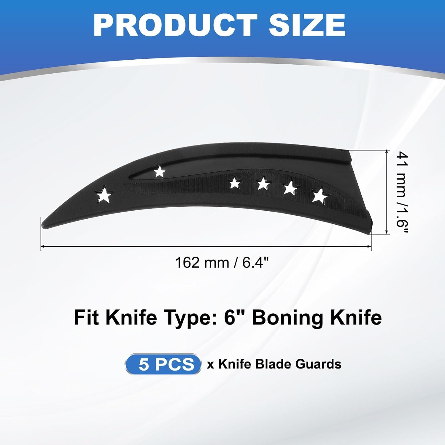 Fit Knife Type: 6″ Boning knife; Color: Black; Size: 162 x 41 mm / 6.4 x 1.6 inch (L*W); Packing List: 5Pcs x Knife Blade Guards