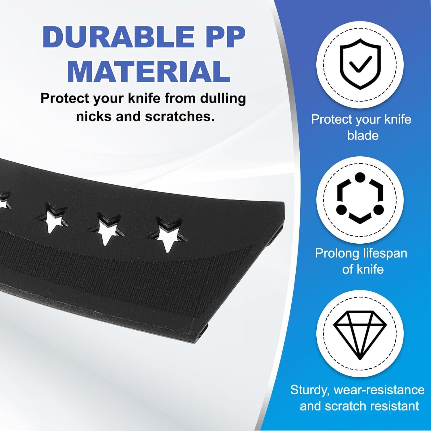 1.The knife cover is made of durable PP material, which is sturdy, wear-resistance, scratch resistant, compact, portable, lightweight and easy to clean.