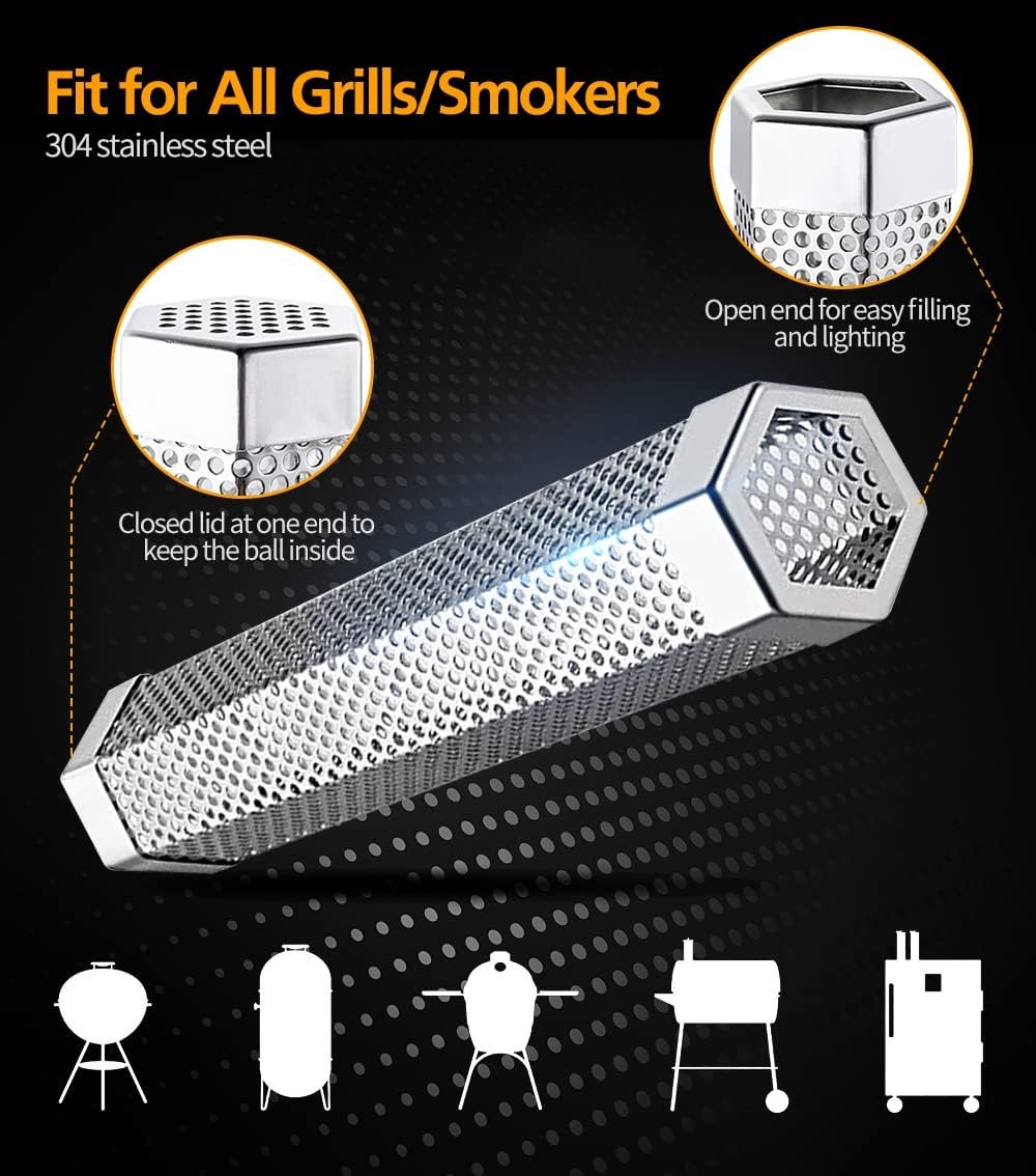 【Safe and Durable】- This smoke tube is made of 304 stainless steel, safe, durable, rust-proof, strong, easy to clean, and not easy to break or bend after repeated use. The hexagonal design prevents it from rolling or falling off the grill, providing you with a better and safer smoking effect