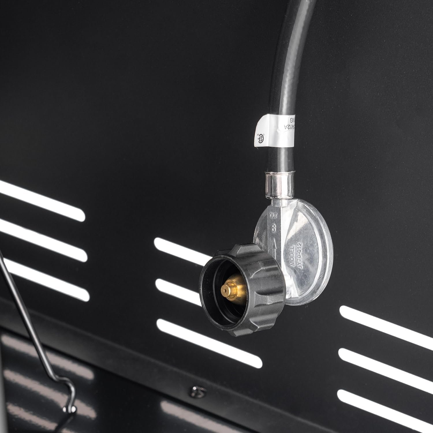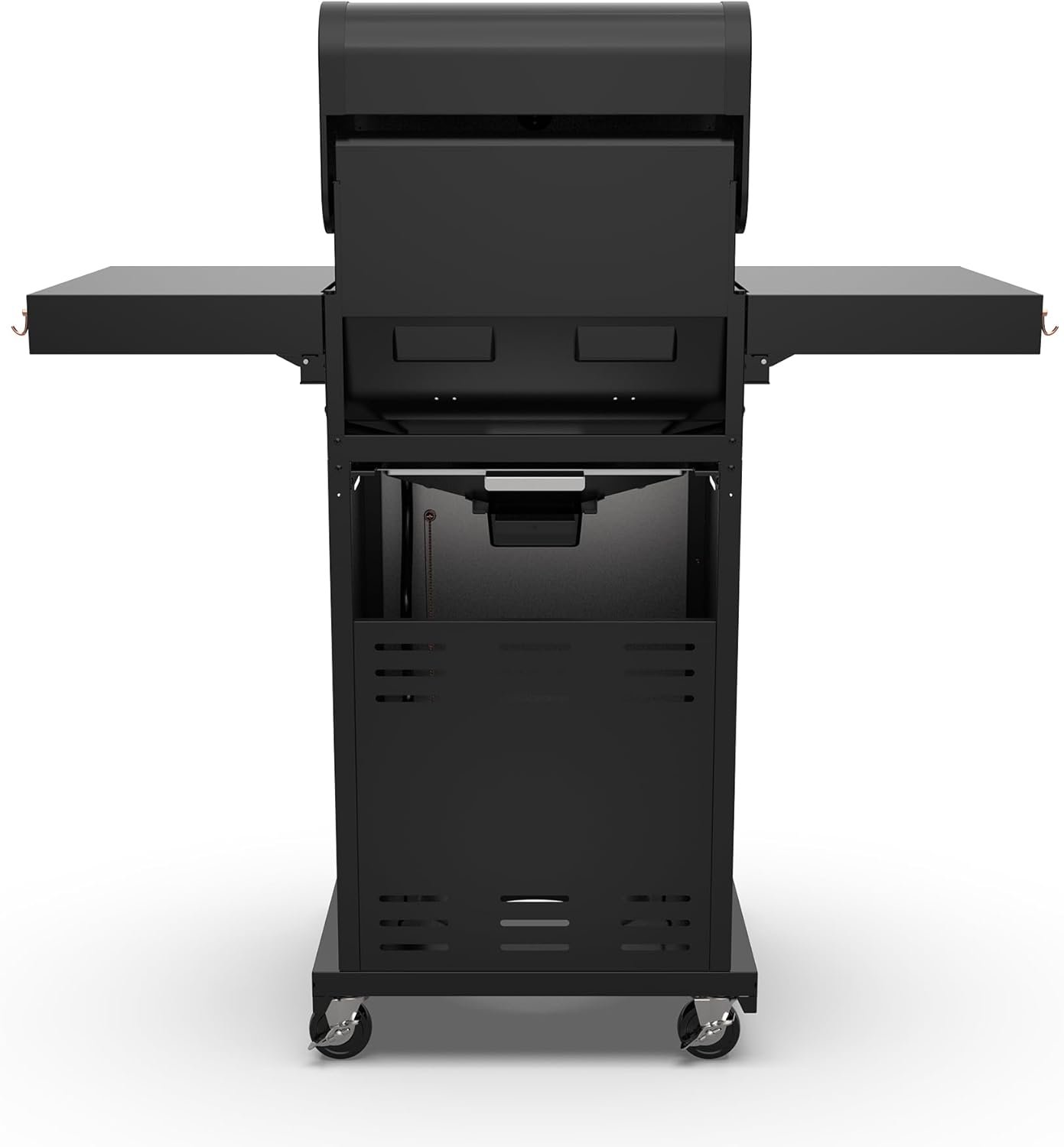 Convenience meets sophistication with features like heat diffusers to evenly distribute heat and flavor, a stainless-steel control panel, chrome-plated knobs, and stainless-steel side shelves. Featuring a pedestal-enclosed cabinet to hide that propane tank. The built-in grill accessories tool holder allows you to hang utensils between grilling while maintaining your side table space for meat, seafood, or vegetables. The folding side shelves fold for compact storage, making it a practical option for smaller spaces.