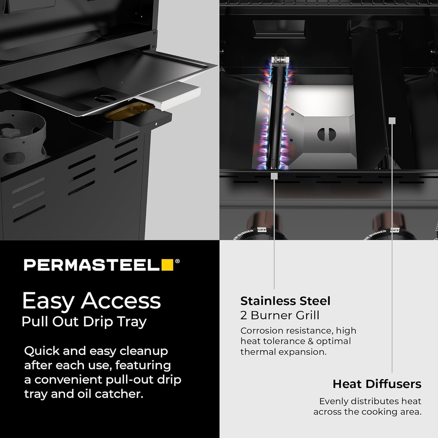 Enjoy hassle-free ignition with electronic ignition and smooth mobility with four caster wheels, including 2 locking casters for stability. Ideal for any outdoor gathering, this Permasteel grill combines functionality with a sleek design, making it a standout addition to your outdoor cooking space.