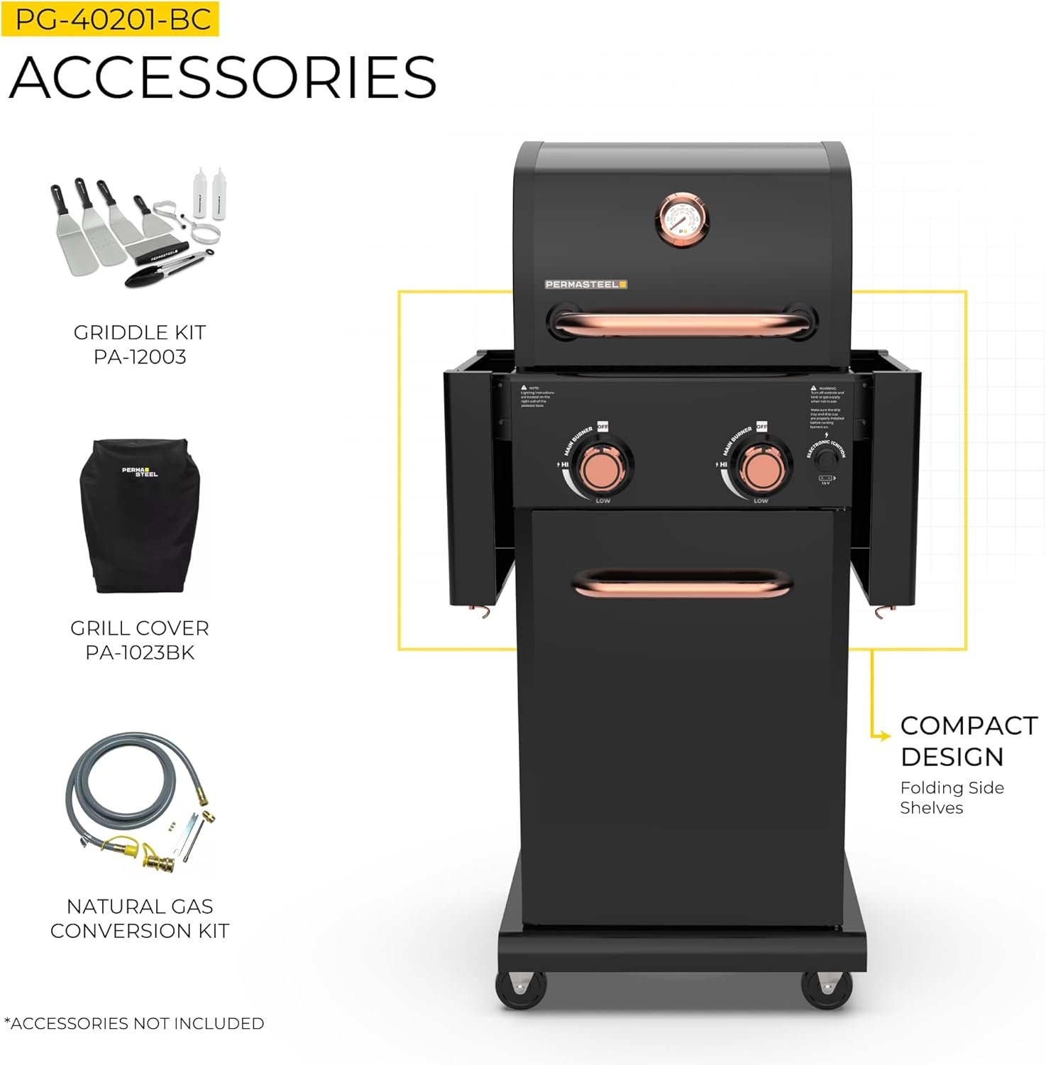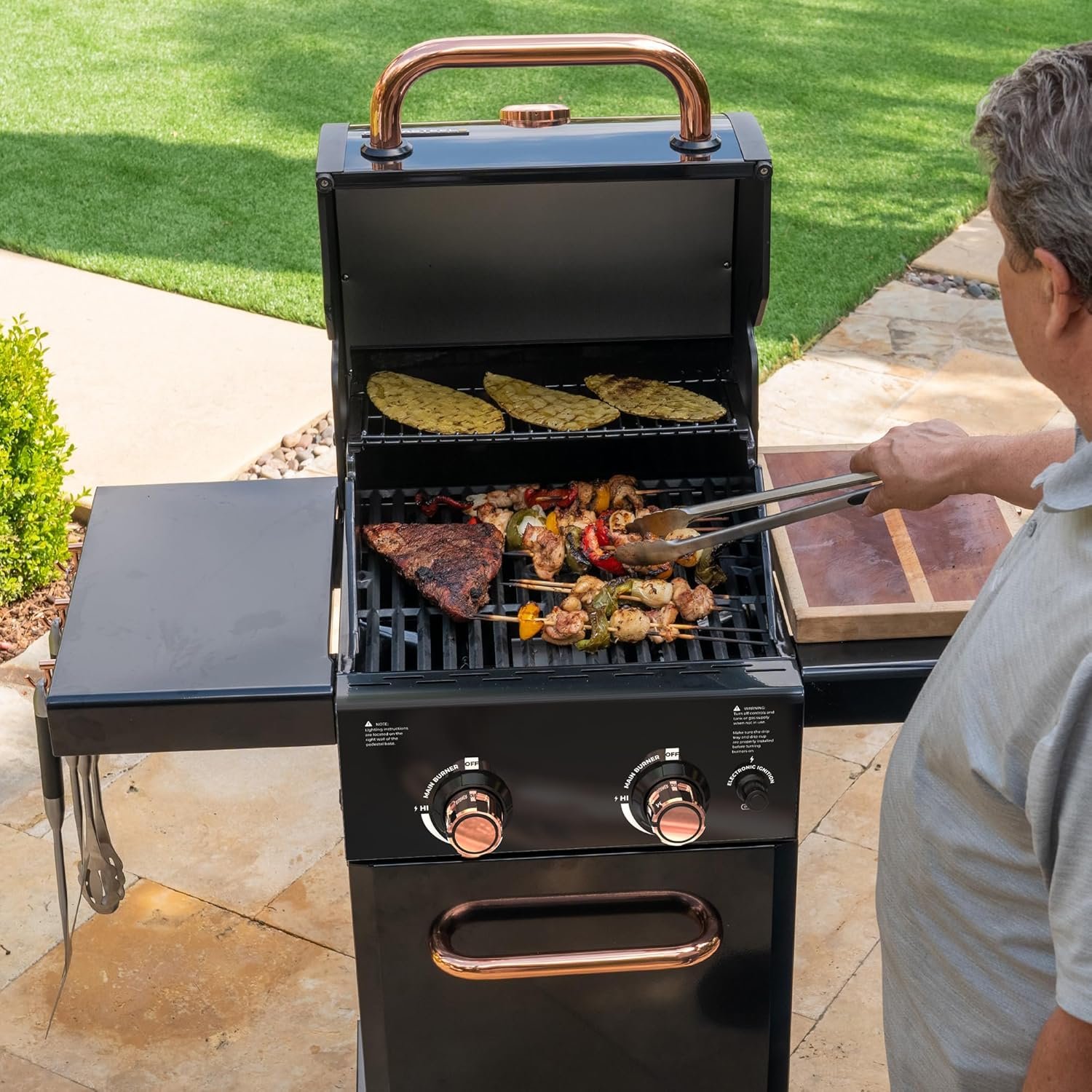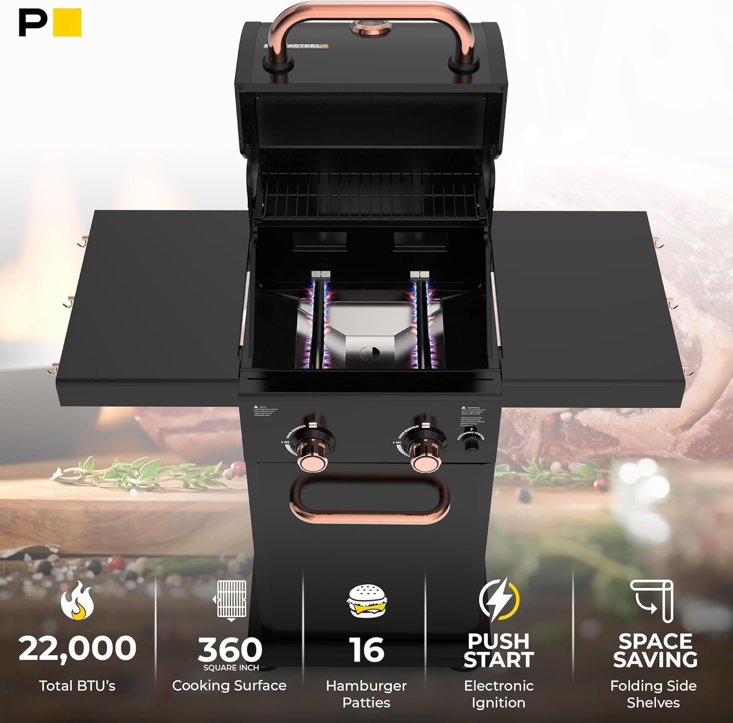 Permasteel 2-Burner Propane Gas Grill, BBQ Grill with Foldable Side Tables & Tool Hooks, Perfect for Outdoor Cooking, Patio & Garden, Black/Copper