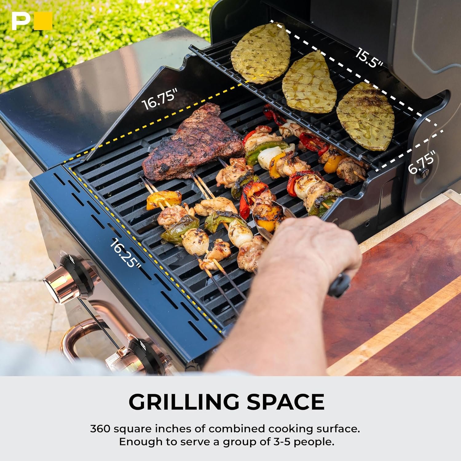 Grilling Surface: Cook up to approximately 16 burgers on a total cooking surface of 360 square inches. The primary cooking surface is 264 square inches. Place food that doesn’t need high heat conveniently on the warming rack to keep it warm while the other items cook. With 96 square inches of additional cooking space, the warming rack is ideal for maintaining temperatures without risking overcooking.