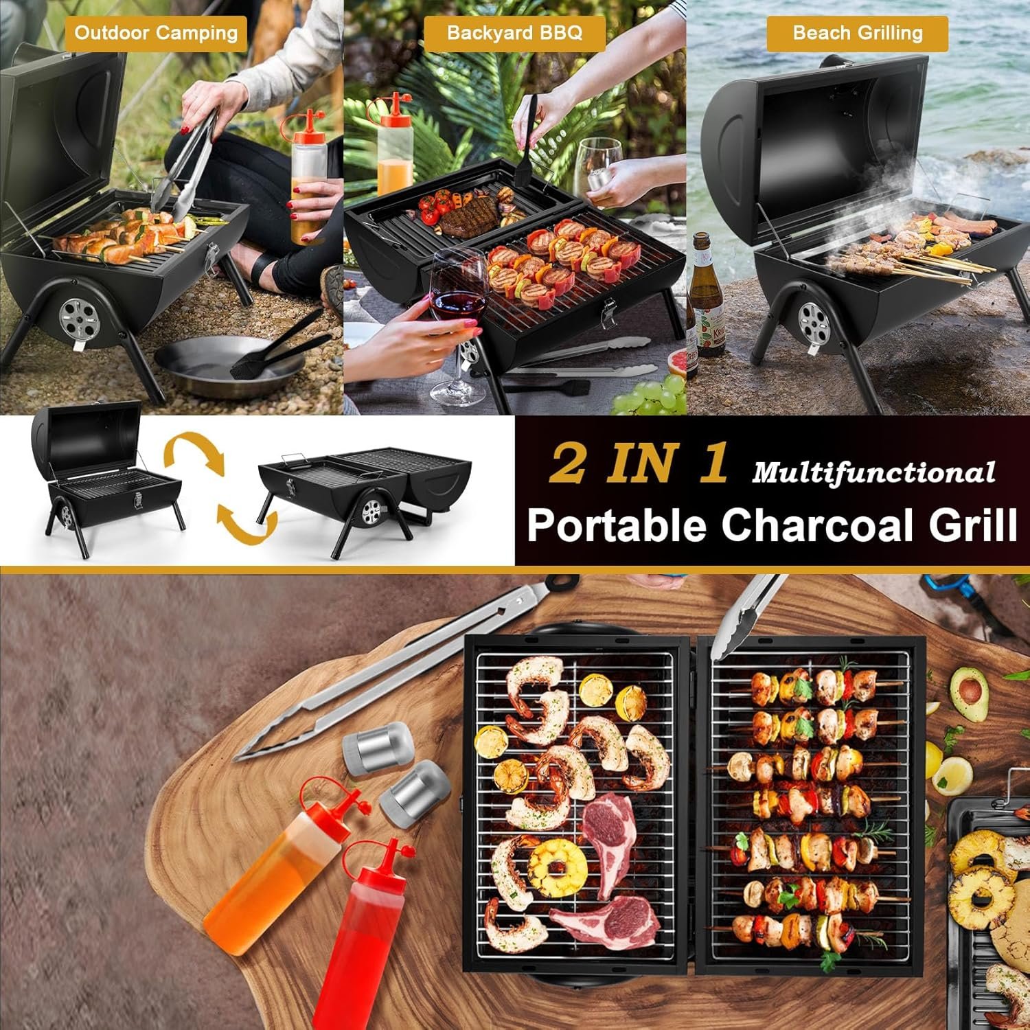 Portable BBQ Charcoal Grill, Joyfair Small Folding Tabletop Barbecue Smoker, 2-IN-1 2-Sided Carbon Grills with Tray, Rack, BBQ Tools, for Outdoor Camping Patio Picnic, Heavy Duty (230Sq.in), 11 PCS