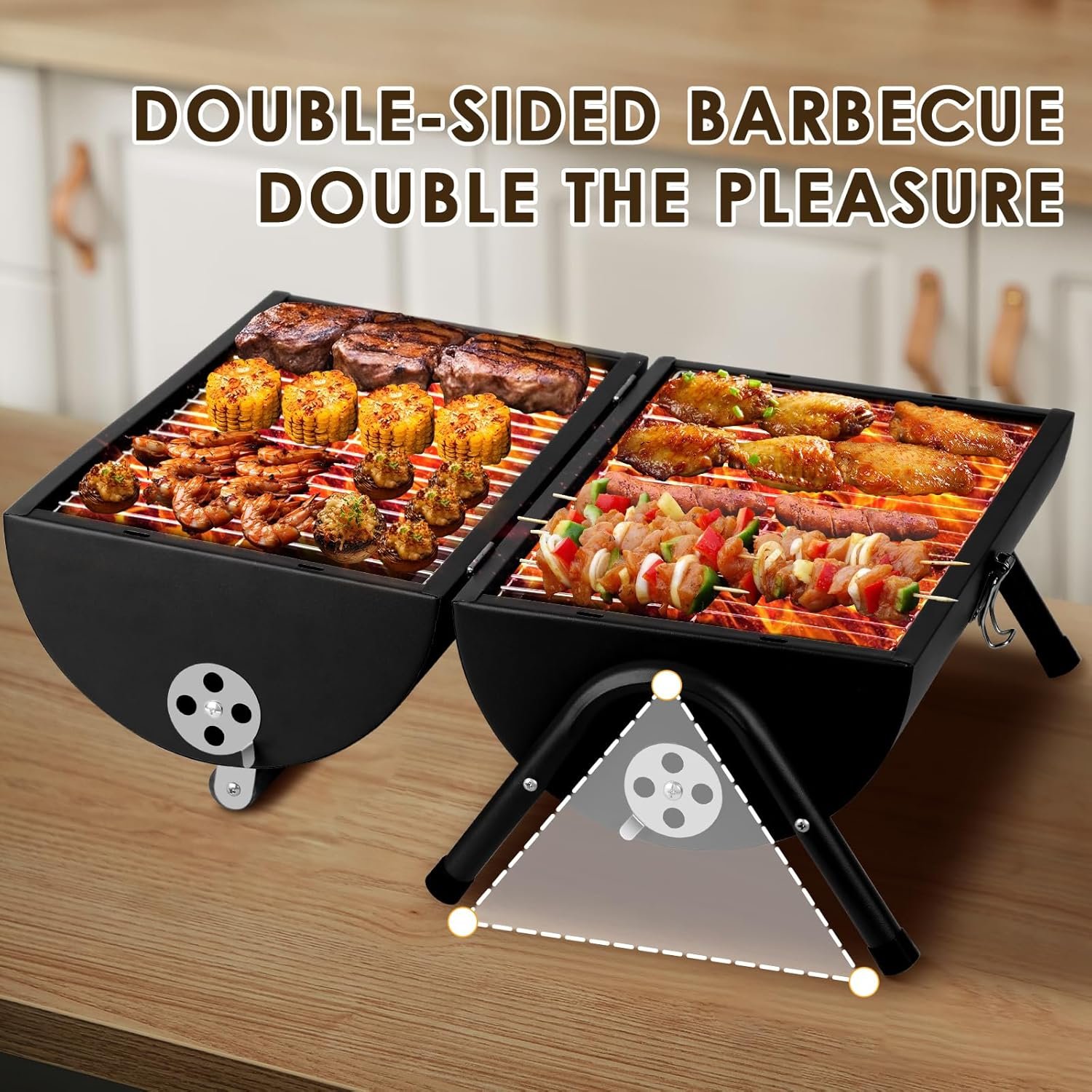 Portable bbq Charcoal Grill Small Folding Table Top Charcoal Grill for Outdoor Camping Two Side Carbon Smoker Griller (Black)