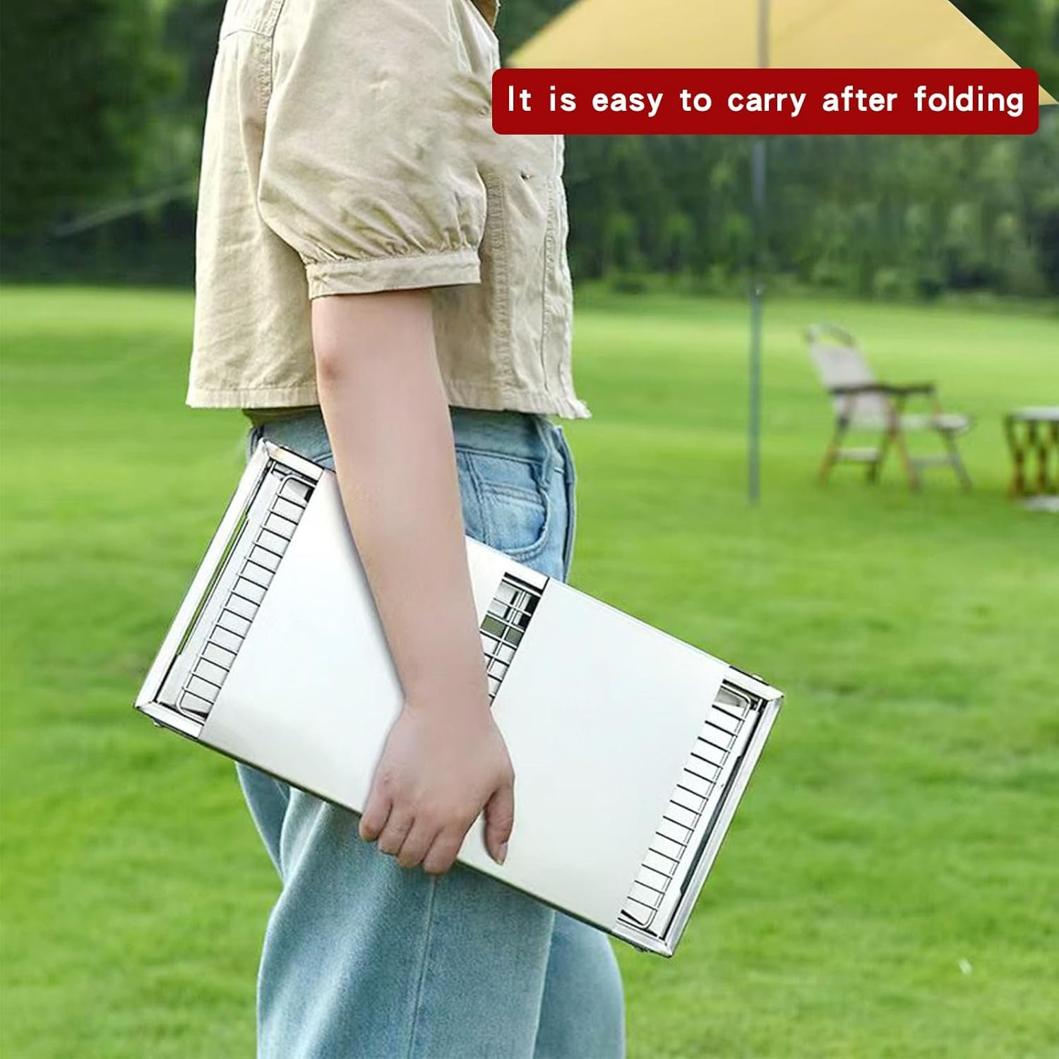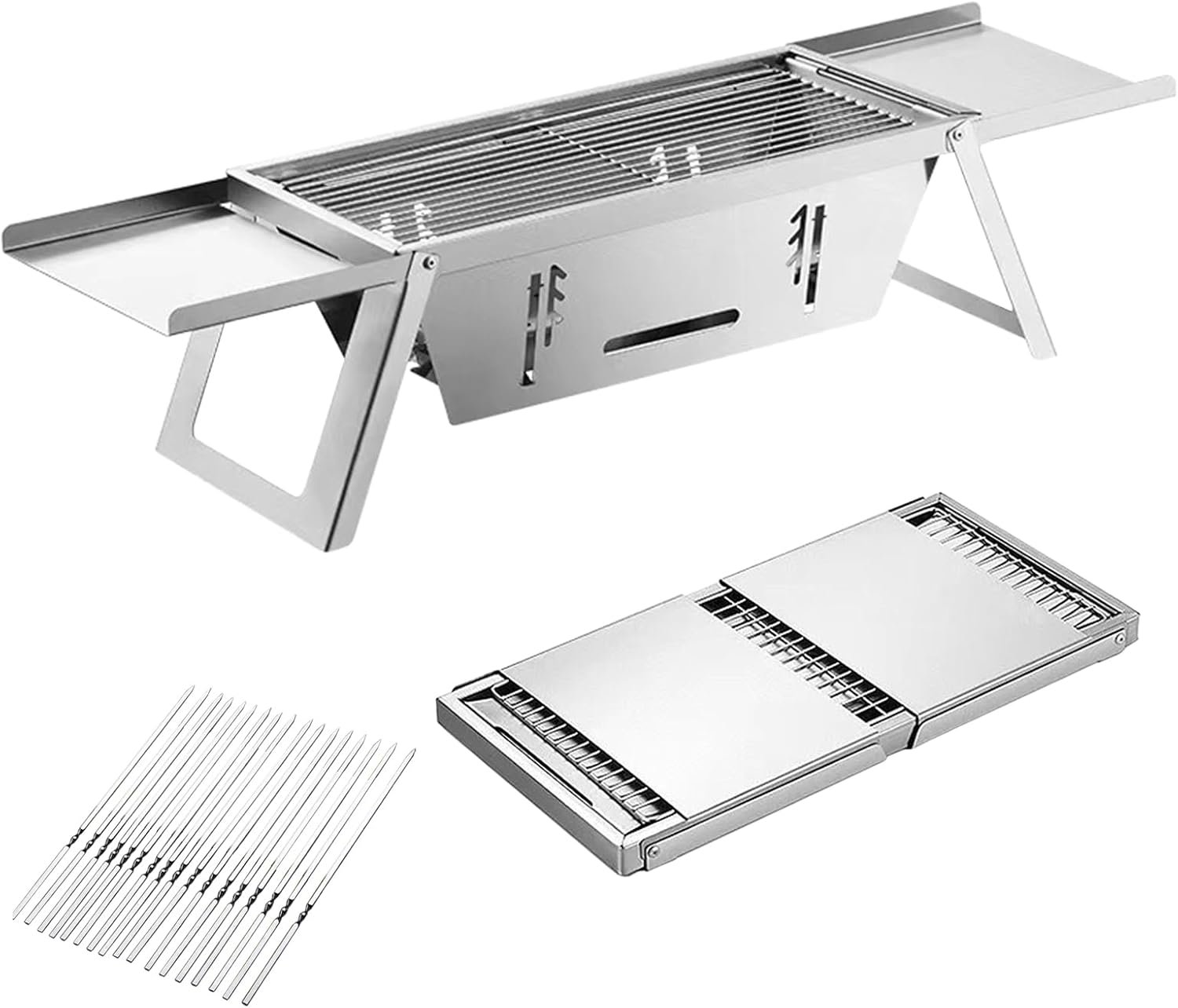 Portable Charcoal Grill, 15-inch Outdoor Small Grill, Folding Stainless Steel 304 Grill for Camping, Backyard, Boat, Comes with 50 Metal Skewers