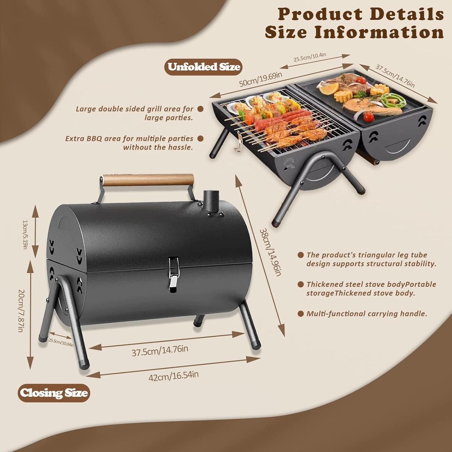 【Structural Details】 The triangular structure greatly improves the stability of the entire grill. The pull rod makes the grill more versatile, allowing it to support the lid for smoking meat. The metal handle acts as a support leg to secure the lid, making it easy to open and move. The strong hinge provides smooth switching and excellent stability.