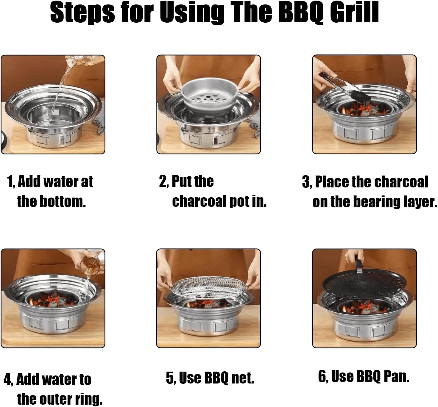【Usage】Before use, it is recommended to take anti scalding measures at the bottom. Add an appropriate amount of water to the bottom of the BBQ grill, place a charcoal pot and charcoal layer, and then add charcoal. Pay attention to maintaining ventilation at the bottom vent and keeping the interior of the charcoal fire ventilated. Then add an appropriate amount of water to the outer edge of the stove, and finally place a barbecue net or Pan. The barbecue Pan provides a non stick heating method, which is more suitable for cooking thinner foods such as bacon and shrimp, while the BBQ net is more suitable for cooking thicker ingredients.