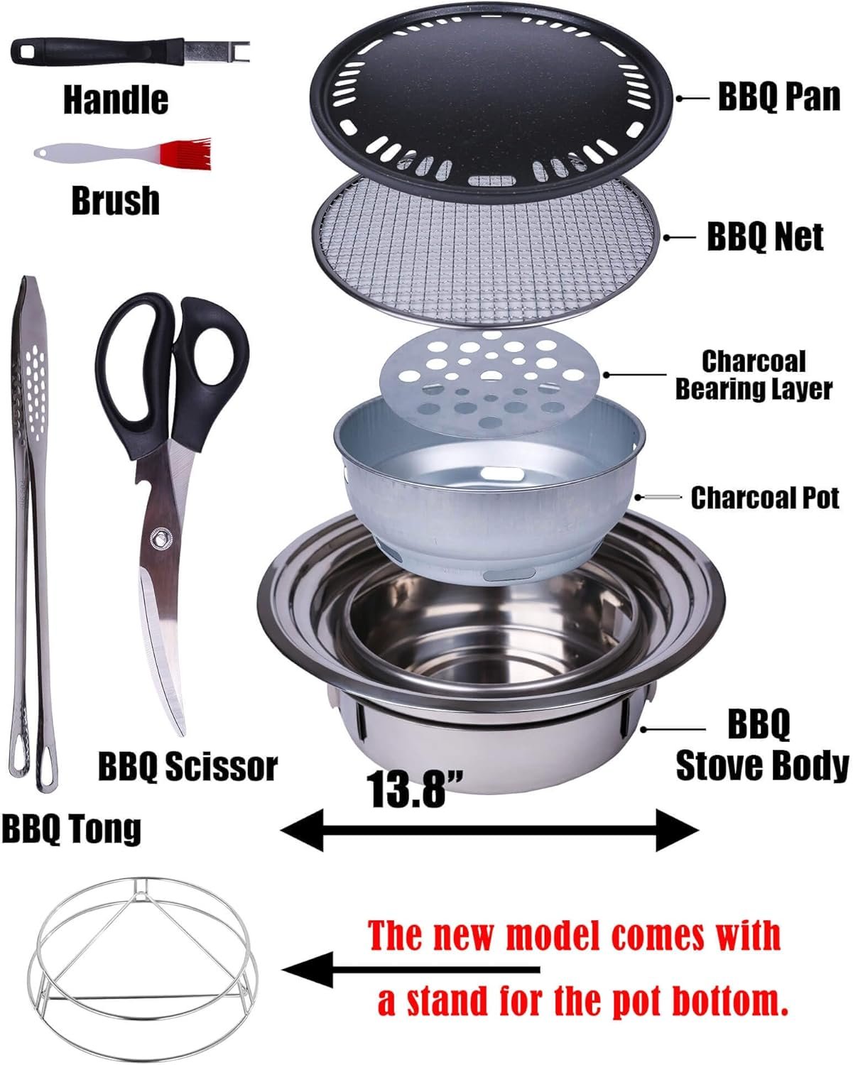 【The Packaging Includes】1*stand for the bottom of a pot, 1*charcoal BBQ grill, 1*BBQ net, 1*BBQ pan, 1*heat-resistant handle, 1 pair of scissor, 1*BBQ tong, and 1 brush.