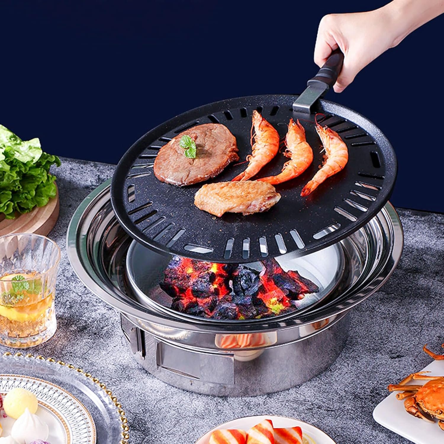 【Attention】Barbecue pan have a non stick characteristic on the surface of rock layers, so avoid using hard materials to scratch the non stick coating during cleaning; This product does not contain charcoal blocks; The charcoal pot is made of galvanized alloy and will change color when used, without affecting normal use.