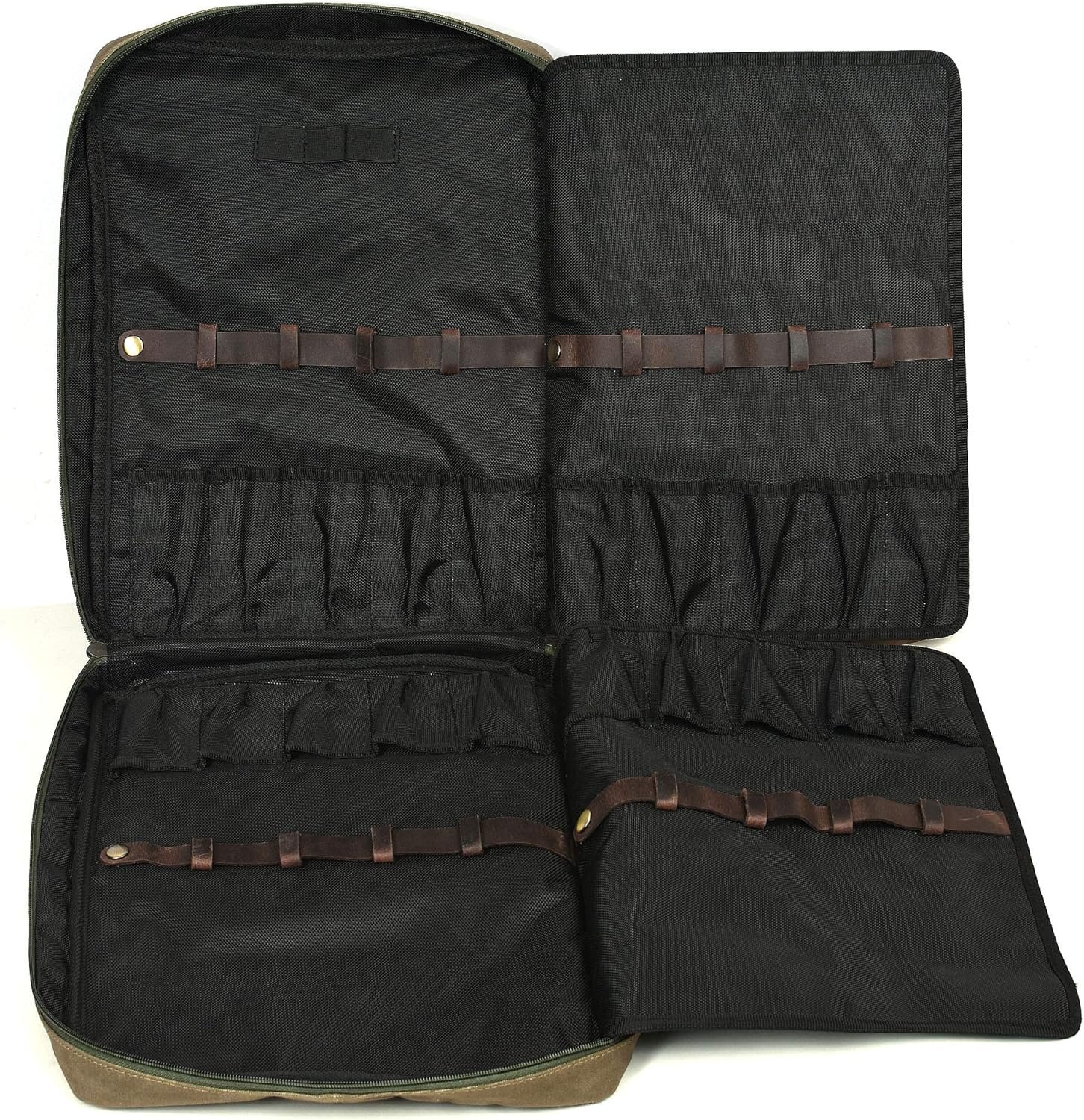 Premium Genuine Leather & Waxed Canvas Chef Knife Bag Retro Backpack | 20+ Slots for Knives and Chef Tools | Hidden Back Pocket for Tablet | Sturdy Knife Bags For Chefs & Students | Olive Green