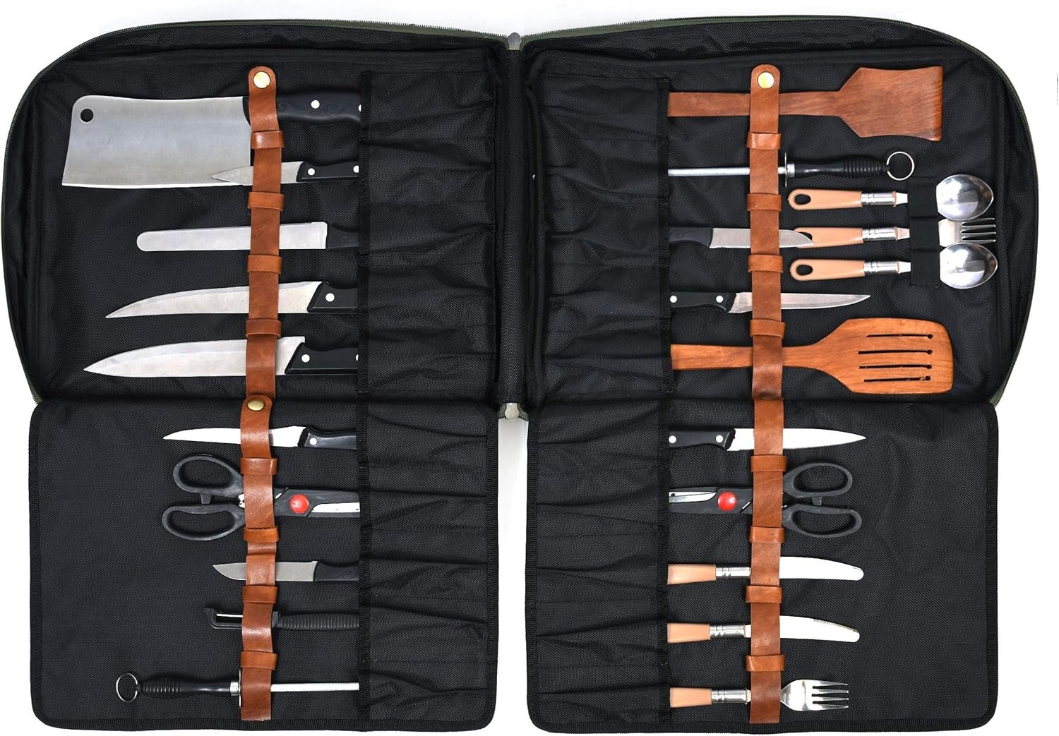 ORGANIZED STORAGE SPACE – Fits entire arsenal of culinary tools (20+ knives & other tools!) & equipment up to 16” knives PLUS special slots for honing rod, pens, AND zippered pouch for extra tools! Large compartments can fit kitchenware, spices, tablet, phone, charger, business cards and more.