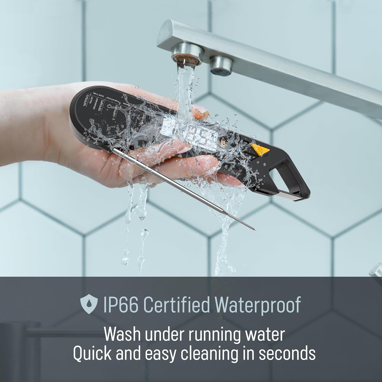 Multi-Use Versatility – Built to last with IP66 waterproof certification and a rugged design, this meat thermometer is perfect for use with an air fryer, oven, grill, BBQ, griddle, or smoker. The 180° rotating probe automatically powers on when unfolded and off when folded, while dual magnets provide convenient storage on any metal surface. Includes a wide hang hole integrated with a carabiner clip for versatile storage options.