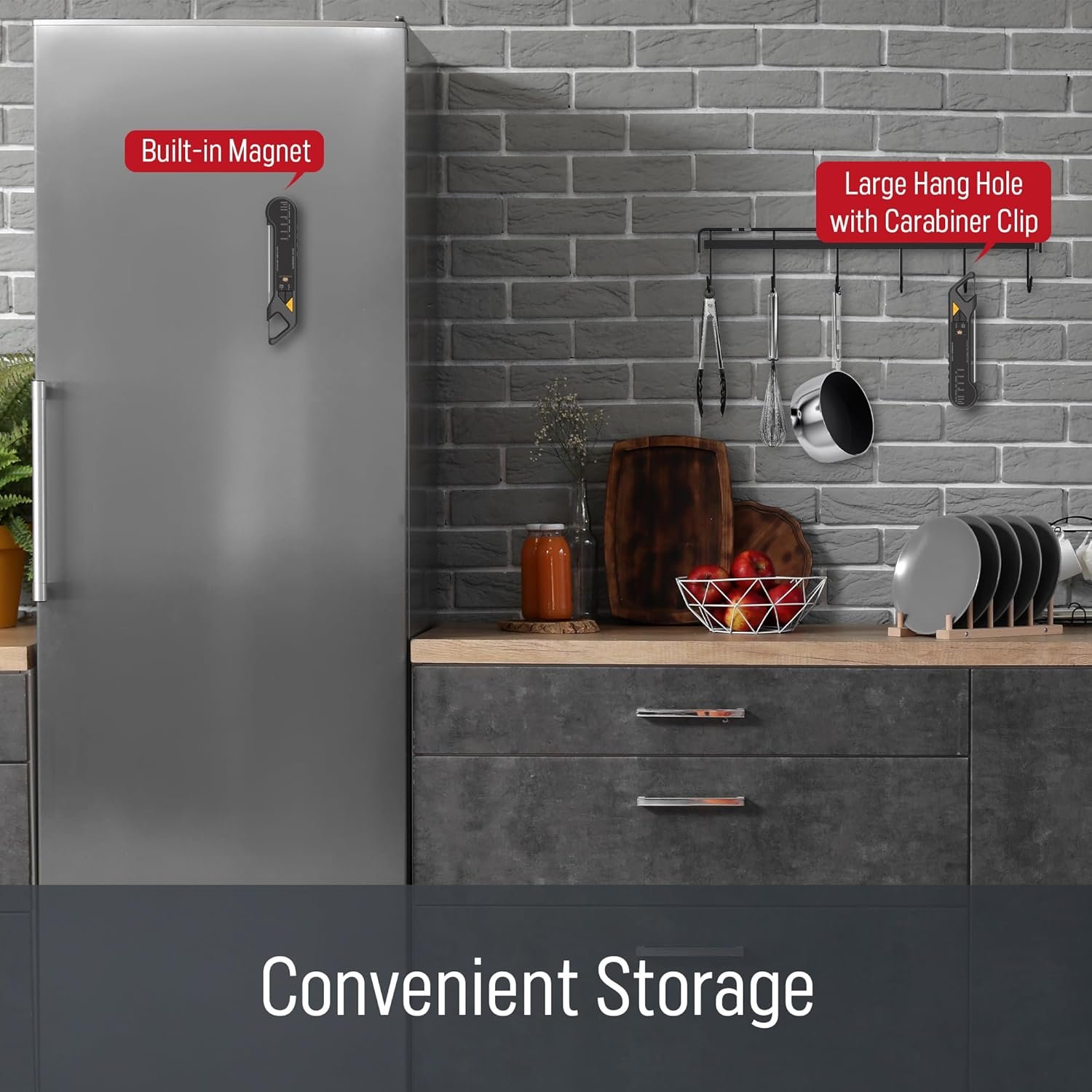 Equipped with two strong magnets for secure attachment to any metal surface, plus a wide hang hole and carabiner clip, this thermometer offers versatile, grab-and-go convenience—perfect for busy kitchens and outdoor grilling setups alike.
