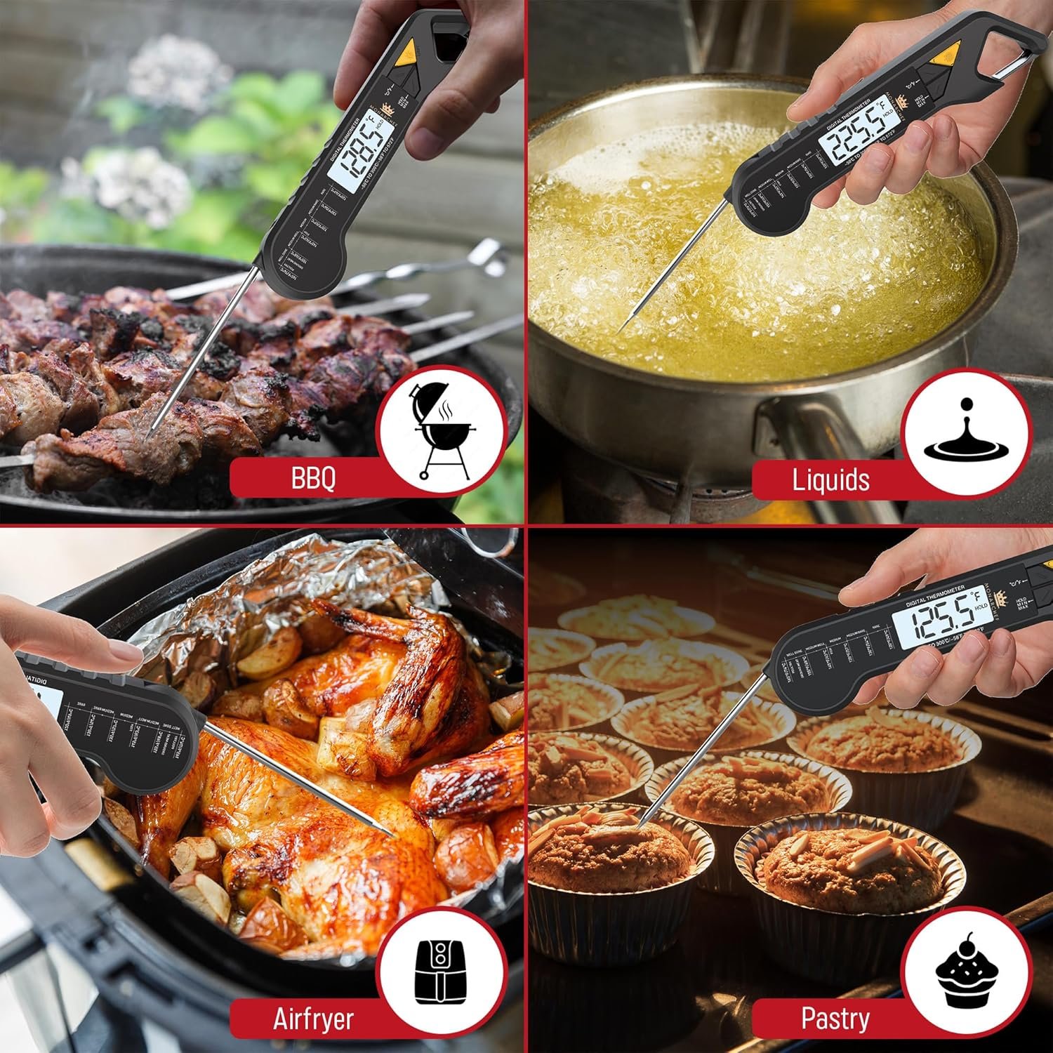 Professional Kitchen Essential – This instant read food thermometer delivers ultra-fast readings in under 1 second with ±0.9°F accuracy. The large, bright display with backlight ensures clear readings from any angle, making it an indispensable tool for both home cooks and professional chefs.