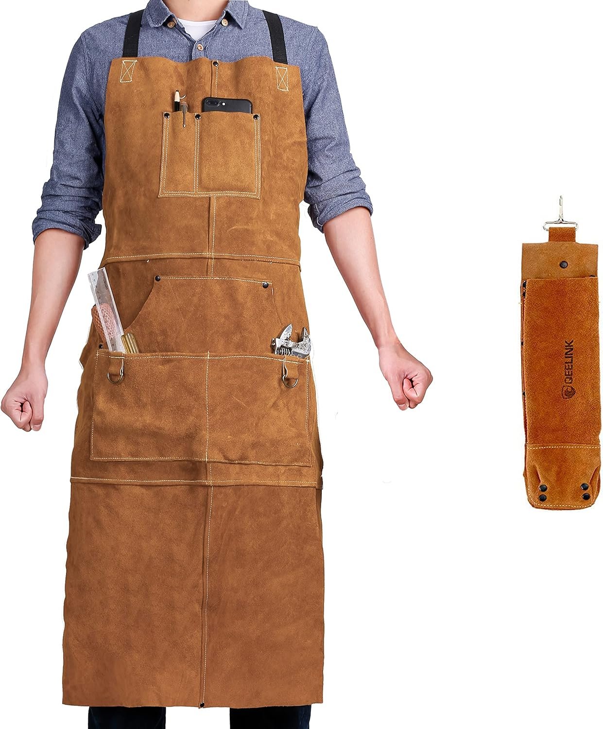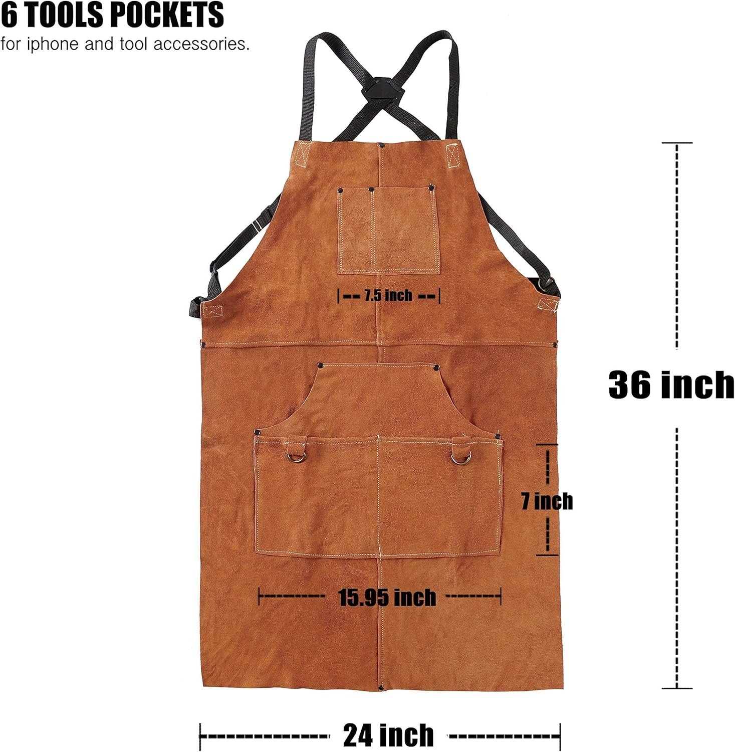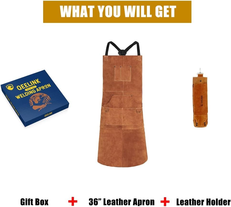QeeLink Leather Welding Work Apron with 6 Tool Pockets, Heat & Flame Resistant Apron, 24″ x 36″, Adjustable M to XXXL
