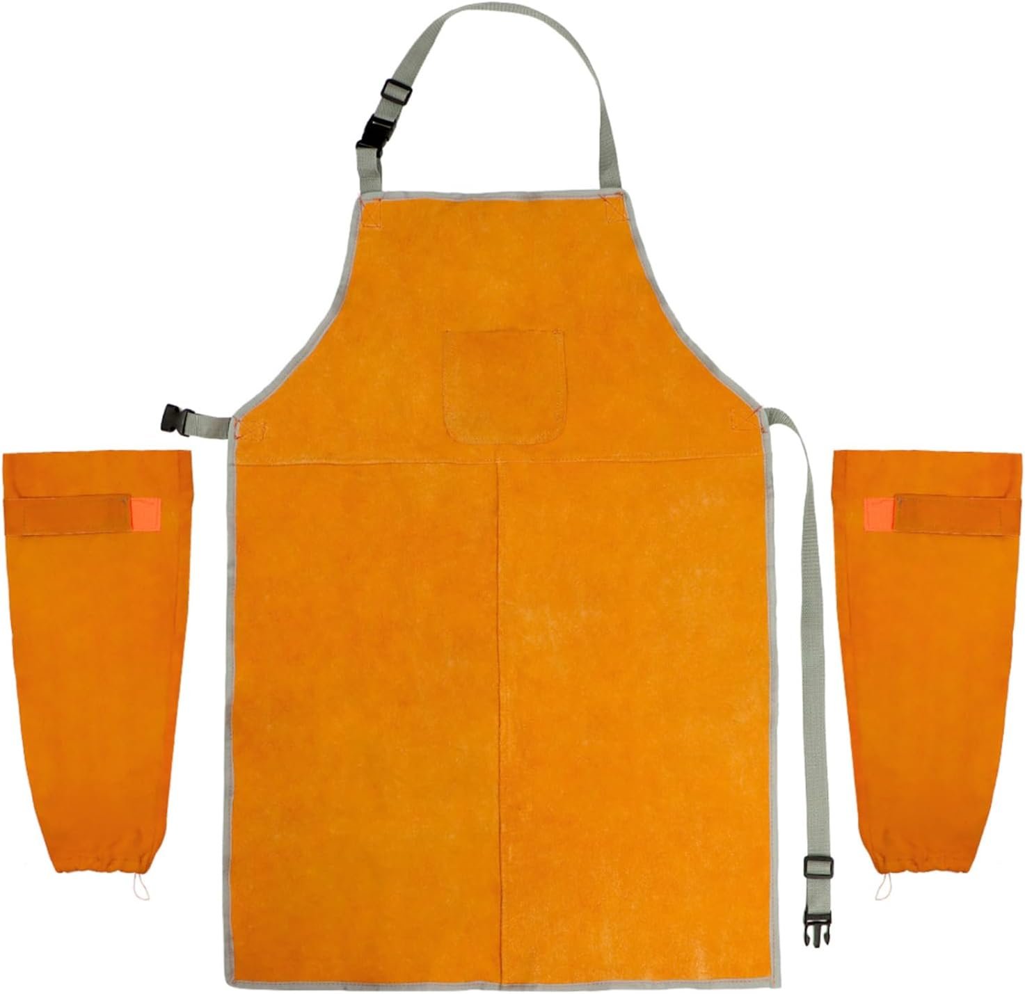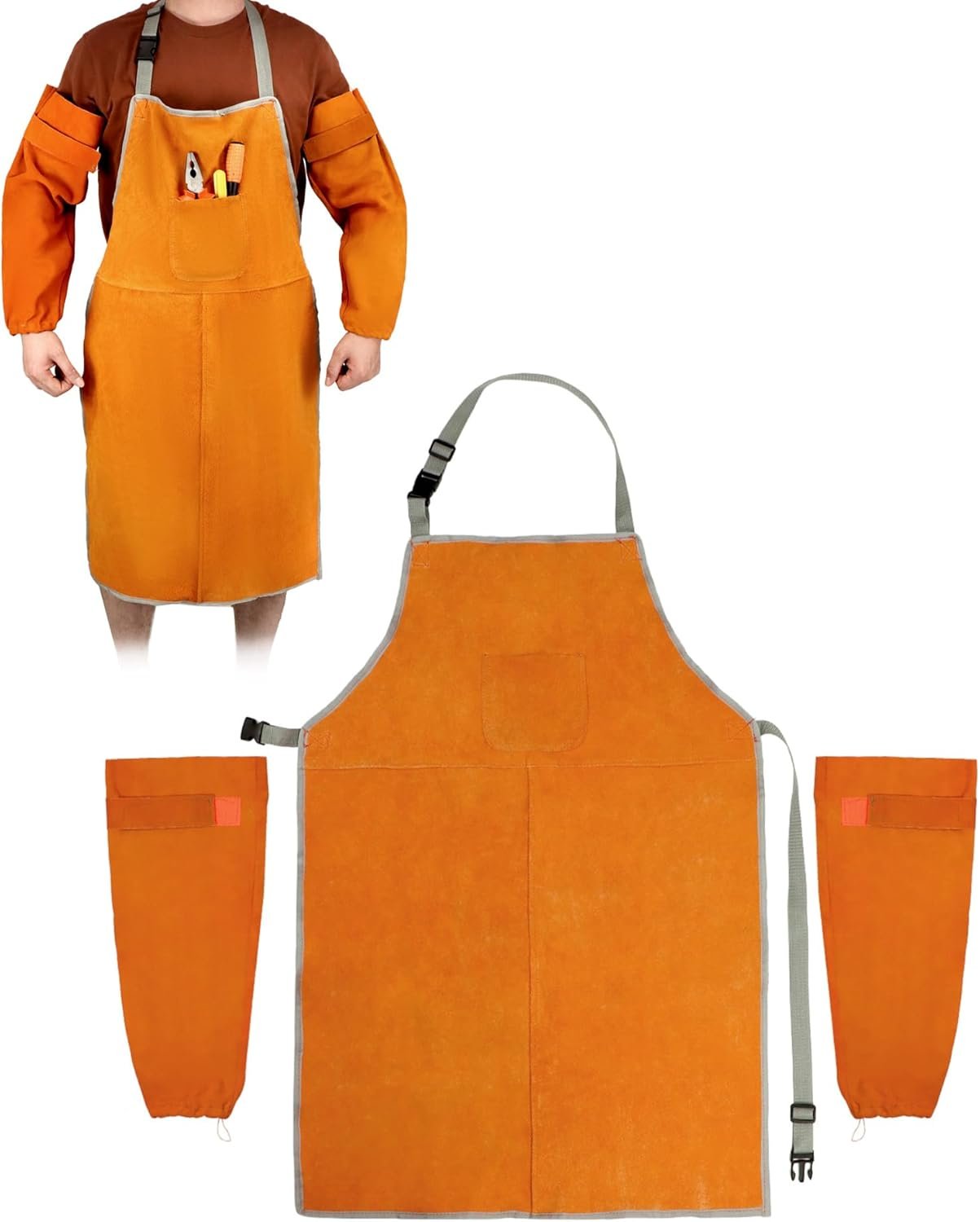 QWORK Welding Apron& Sleeves, Welding Work Protectors Set, Heat and Flame Resistant Leather Work Shop, Blacksmith Protective or Safety Clothing, Welders, Fireplace, Gardening, BBQ Apron, Bib Apron