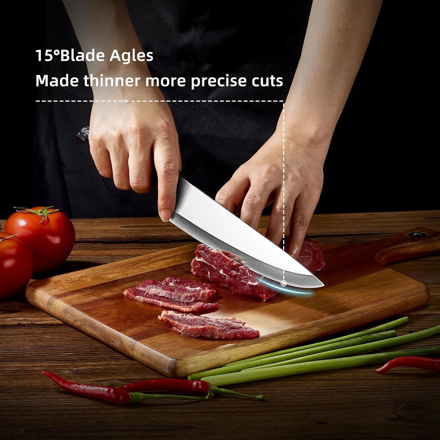 Enduring Knife-sharpness:The knives set made of premium 5Cr15MoV German stainless steel that can stay sharpness for months.remarkable HRC of 55-60°makes the kitchen knives sharper and reaches the level of professional cutting!
