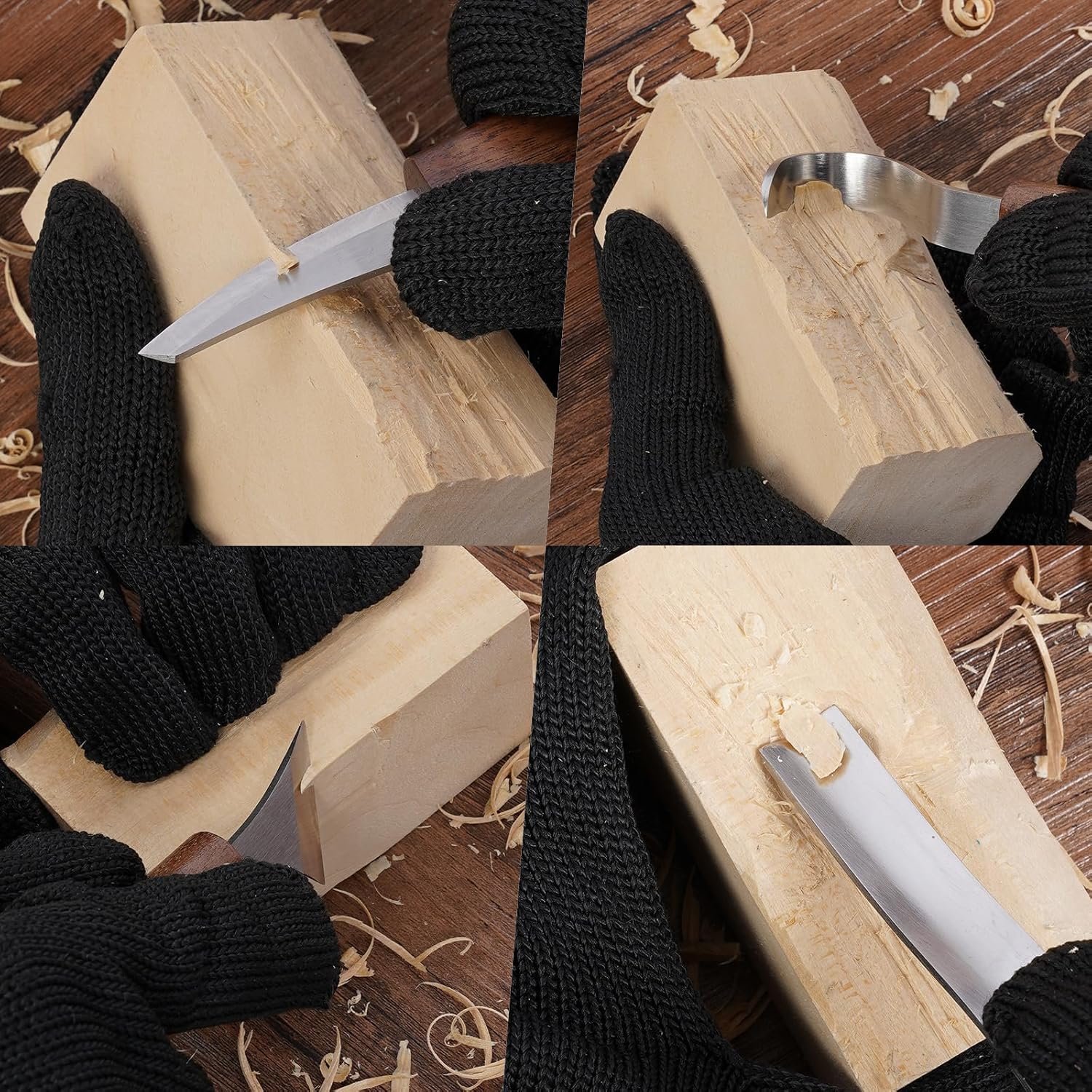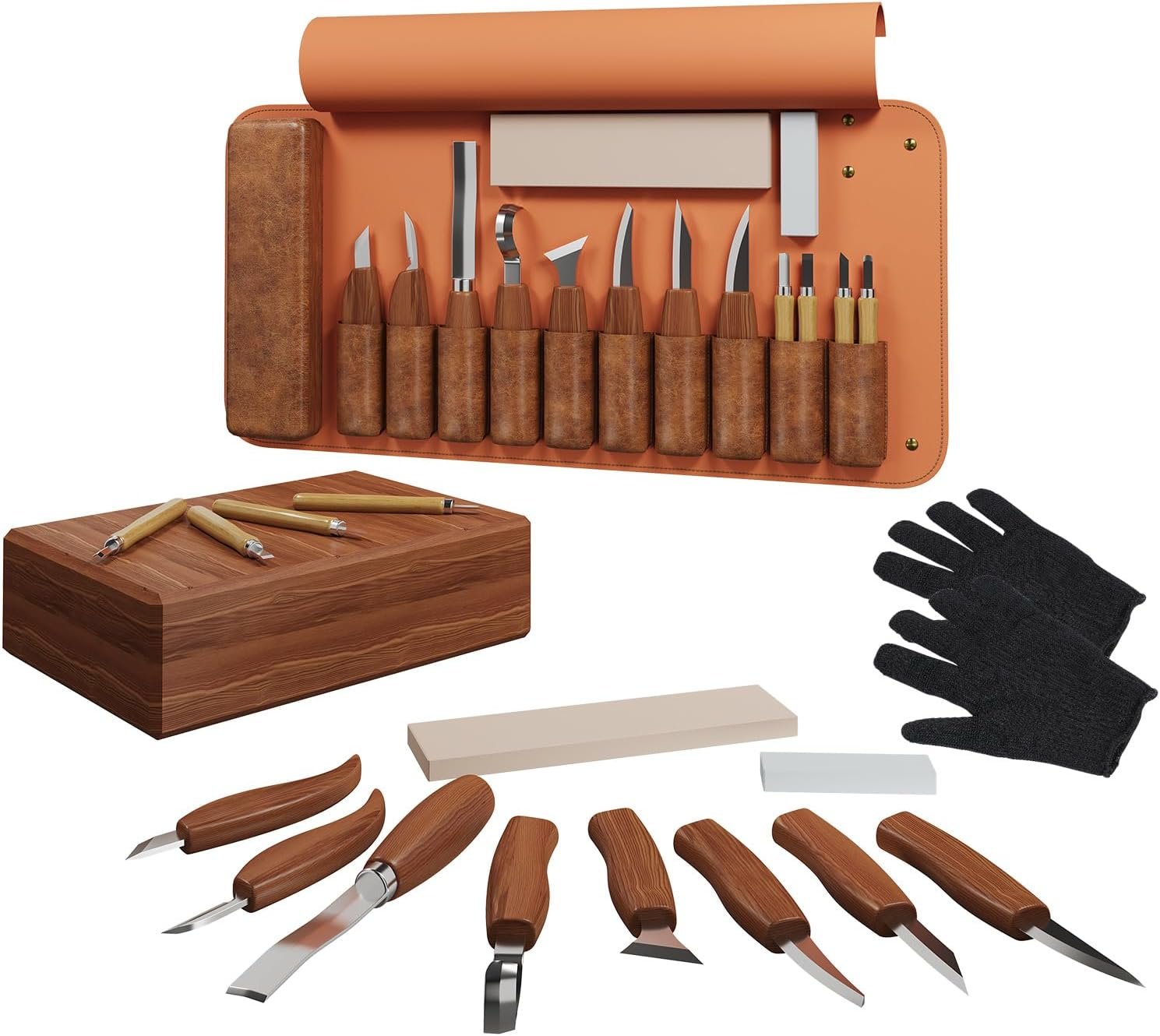 【16-Piece Wood Carving Kit】 This wood carving kit includes 8 wood carving knives, 4 detail carving tools, gloves, polishing compound, sharpening strop, and a leather roll. Ideal for beginners and experts, this whittling kit provides the perfect tools for precise wood carving, from simple projects to intricate designs.