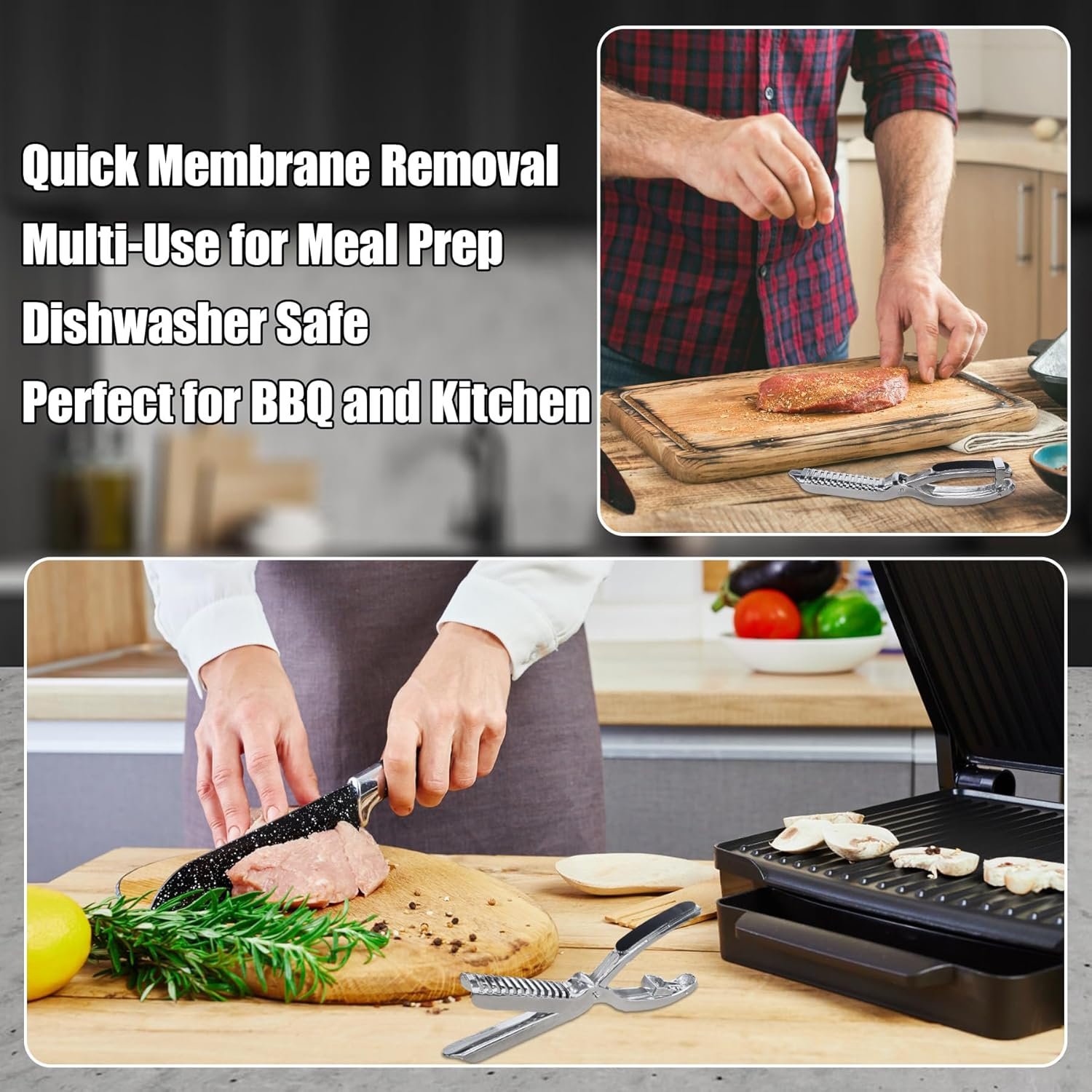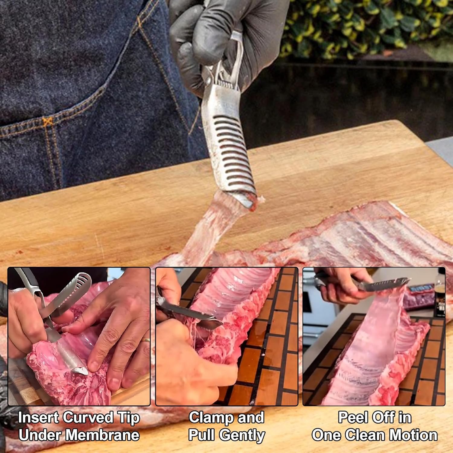 【Smart Design for Easy Removal】 Engineered for precision and comfort, the dual-function blade features one side designed to slide under tough membranes and another to trim excess fat. Simply insert the pointed tip under the membrane, clamp gently, and pull away in one clean motion. This tool is ideal for prepping ribs, pork, beef, or poultry, making it an essential accessory for any kitchen or grill station.