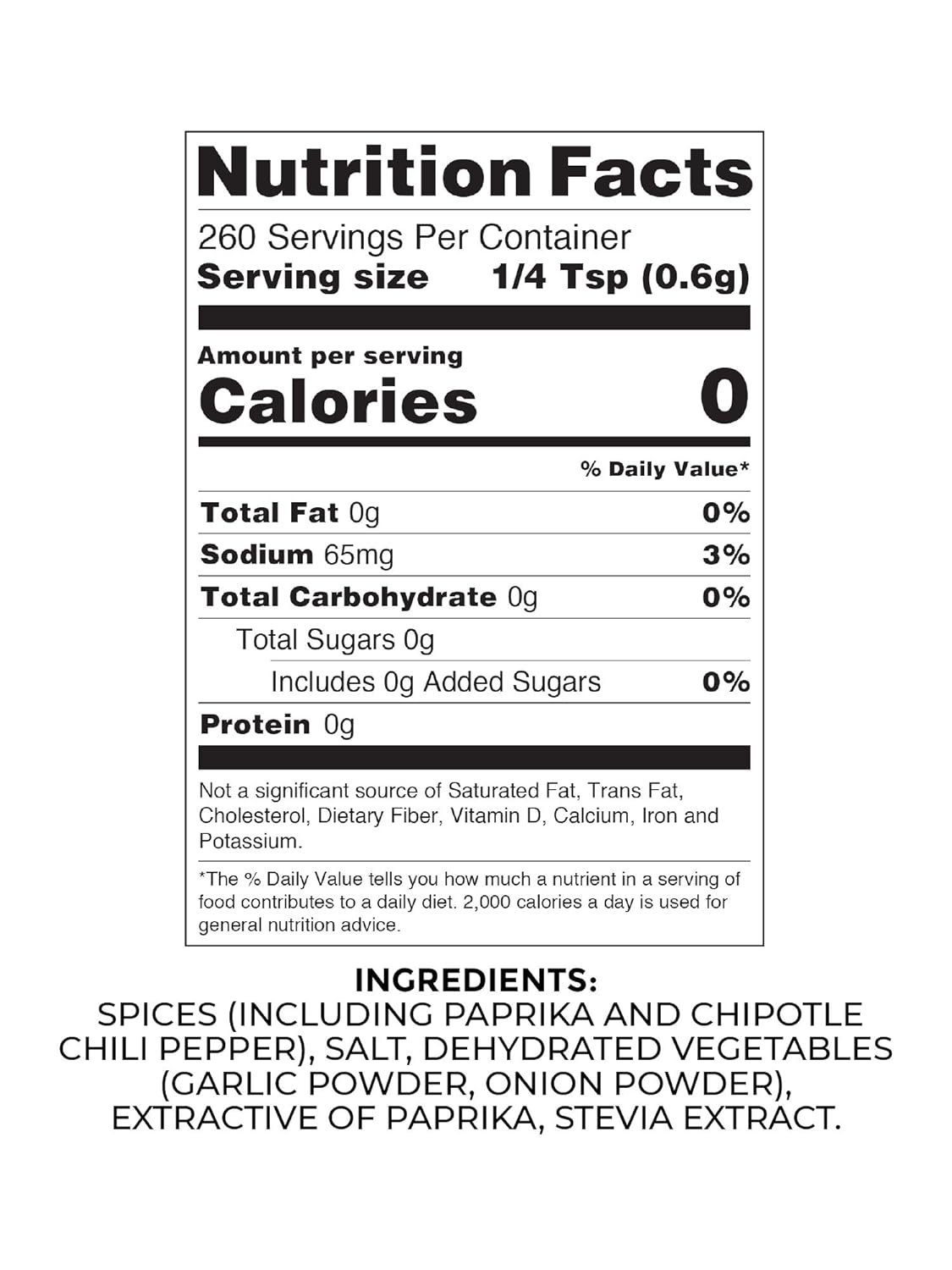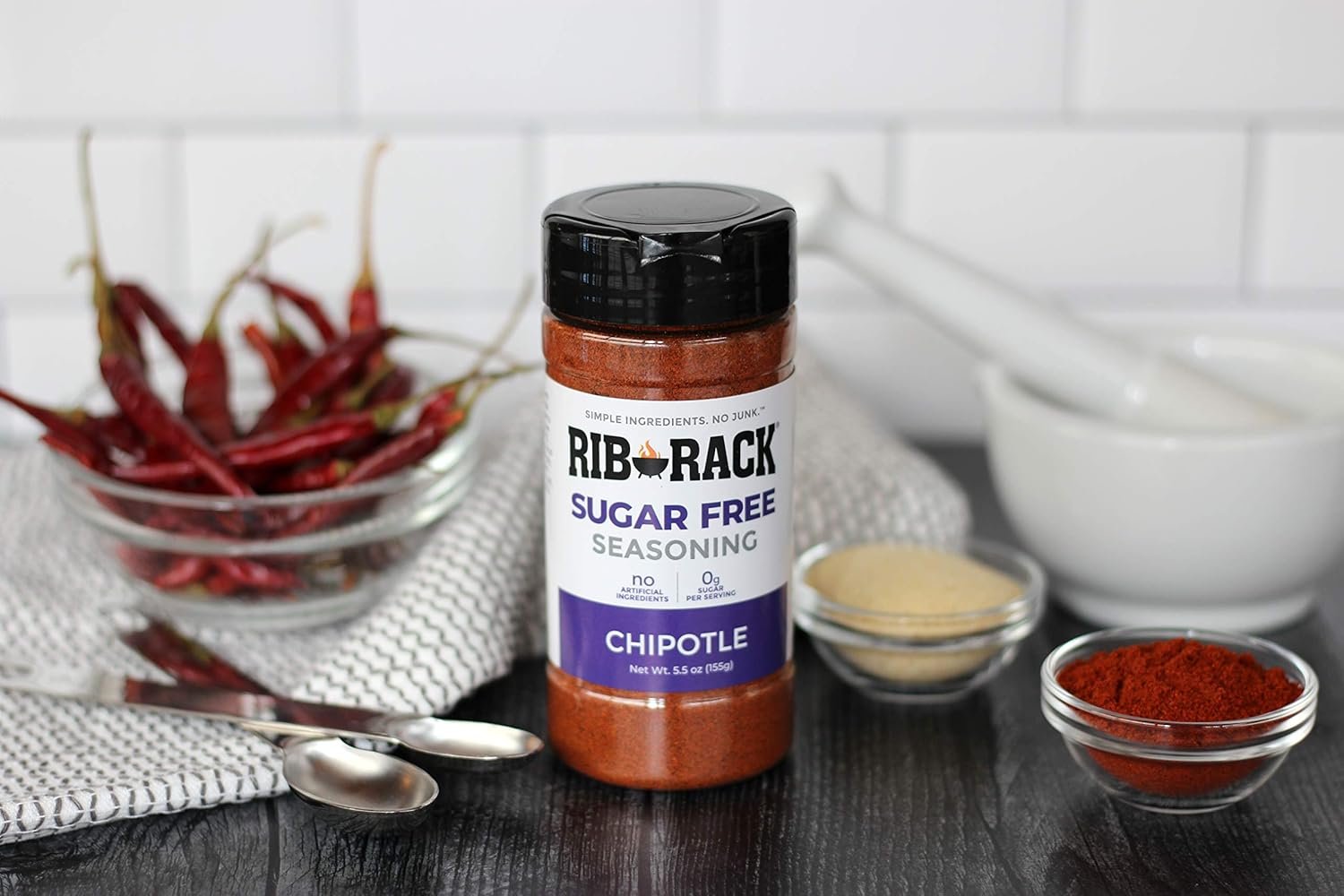 Contains (1) 5.5oz bottle of Rib Rack Chipotle Sugar Free Seasoning