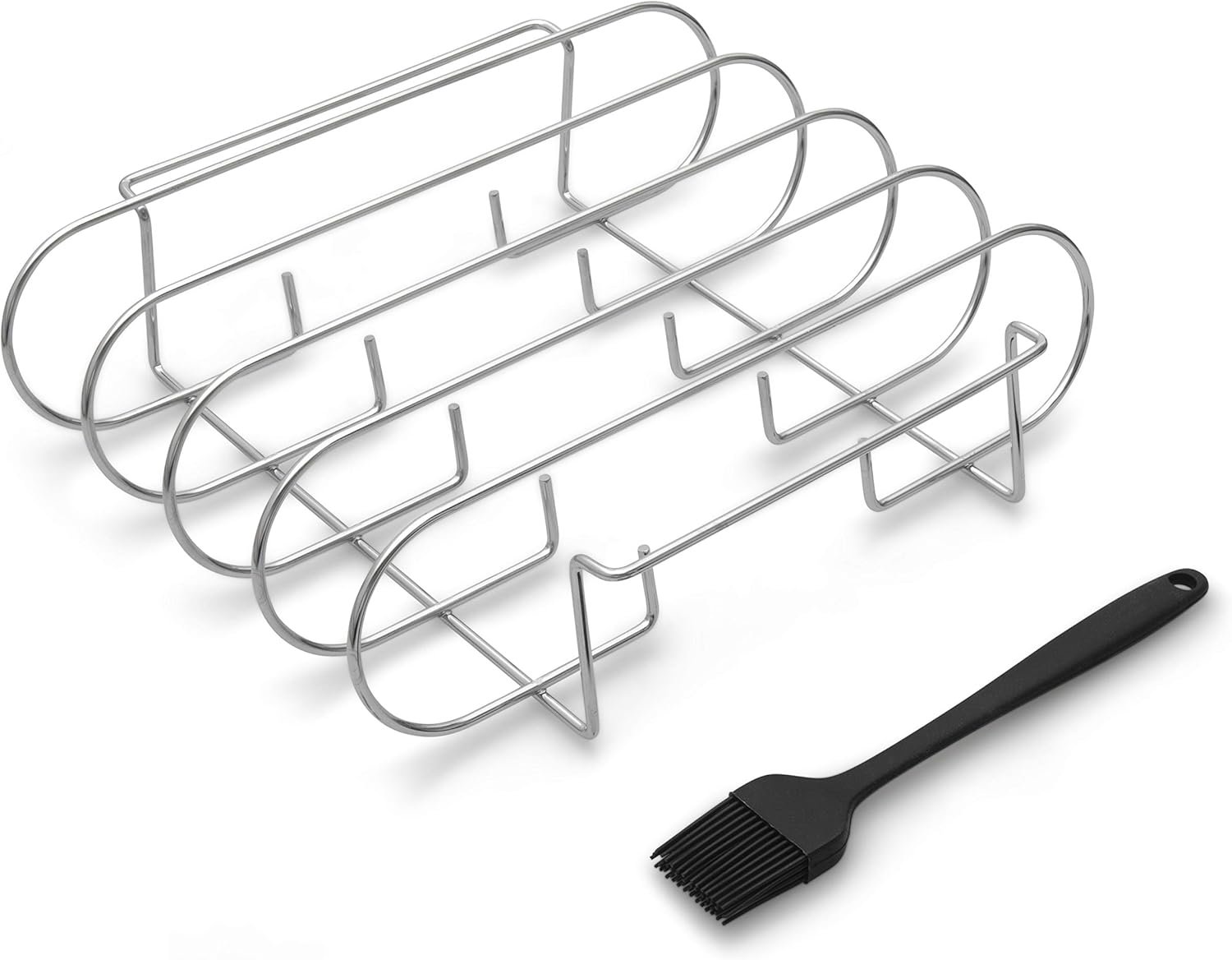 Rib Rack with 4 Slots – Heavy Duty Stainless Steel Barbecue Meat Roasting Grilling Stand with 2 Easy Grip Handles – Complete with Silicone Basting Brush